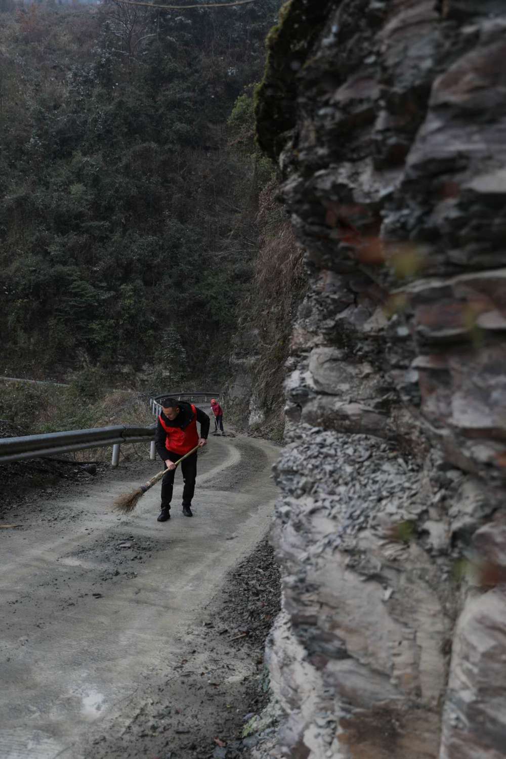 时节刚过大寒,亦是正月初一。一夜大雪,天明未停,白雪漫山。 清晨6点,谢宗旬披衣起床,借着朦胧的天光,看着窗外飘飞的雪花喃喃自语,“雪这么大,气温又低,双河岩口的路面怕是要起凝(结冰)哦。” 身为彭水苗族土家族自治县乔梓乡水花村党支部书记、村委会主任,又是水花村38.4公里村道的“路长”,谢宗旬一直记挂着高海拔地区的路面情况,“双河岩口的最高海拔有1100多米,天冷了起凝,车子过危险得很。” 越想越放心不下的谢宗旬走出家门,发动汽车引擎,驾车沿着任家盖山蜿蜒的公路驶往双河岩口。 ▲彭水苗族土家族自治县乔梓乡水花村党支部书记、村委会主任、“路长”谢宗旬(左)给路段保洁员交待寒潮天气下的注意事项。 特约摄影 赵勇 摄 双河岩口巡查 未“起凝”才放心 “这点是水花村通往桑柘镇太平村的必经地,平时车流量就大,正月间车更多。”山势增高,雪花如鹅毛飘洒,路两侧已有不少积雪,心里焦急的谢宗旬靠边停车,掏出手机联系着家住双河岩口附近的公路保洁员谢光泽。 “老辈子,双河岩口起凝没?” “我一早起来看了,下的是泡雪,现在车子通行是没得问题的。” 谢宗旬心里悬着的石头暂时落了地,“眼见为实,我还是上去看下。” 沿途,道路两侧边坡出现了多处小垮塌,路面布满砂石、小石块、树枝等障碍物。 “路上有石头呢,晚一点你过来清理下……”每经过一段边坡垮塌路段,谢宗旬就停车联系该路段的责任保洁员,通知他们及时清理路面障碍物,保证路面整洁与行车安全。 一路走走停停,平时车程仅半个小时左右的距离,谢宗旬竟开了接近两个小时。 临近上午8点,谢宗旬赶到了双河岩口。 下了车,谢宗旬在公路上来来回回走了几趟,确定路面没有结冰后,他这才放下心来。 “老辈子,这段路植被好,大树多,雪大了树枝要断,要辛苦你随时检查、随时清除。”遇到在双河岩口巡查的谢光泽,谢宗旬又反复叮嘱。 随后,两人一起将“冰雪路面,小心驾驶”的安全警示牌摆放路旁显眼位置,提醒广大驾驶员注意安全。 ▲彭水苗族土家族自治县乔梓乡水花村双河岩口白雪皑皑。 特约摄影 赵勇 摄 清理路面砂石 随时注意人身安全 告别谢光泽,谢宗旬又走访了几户村民,沿途还安置了几块安全提示警示牌。 飘飞的雪花里,谢宗旬驾车踏上回程,顺便沿途查看保洁员对路面障碍物的清理情况。 “节日期间,车流量大,必须加大管护力度,保证行车安全。”谢宗旬告诉重庆日报记者,2021年开始,彭水全面实施农村公路“路长制”,明确总路长、县级路长、二级路长、三级路长的职责,按照“一路一长、属地管理”的原则,彭水全县7169公里的农村公路有人管、管到位,以“路长制”实现“路长治”。 盘山公路往下,路边积雪逐渐稀少,裸露的岩石却让人看着揪心。因为这些石头风化都很严重,容易塌方。 平时,这些路段都有保洁员负责管护,但如果遇到大的塌方,就必须调运铲车等设备来清理。 “水花村大多数地方是沙坡地,疏松容易滑坡,每年都有几次大的塌方。”行至水花村六组沙坡路段,谢宗旬遇到了正在清除路面砂石的保洁员淳泽英。 “我昨天才清理,今天又落下这么多。”淳泽英颇有些无奈。 她负责的3公里多公路,一面是悬崖,一面是沙坡,虽然几乎每天都要清扫一次,但掉落的石块似乎永远也扫不完,“看地名都晓得有好恼火,沙坡、窑湾、磬湾……不是坡就是湾,随时都在掉石头。” 看到淳泽英忙个不停,谢宗旬也从车上拿出竹制扫把,一起清扫路面,“要保障行车安全,也要注意自己的安全……”