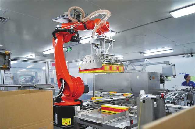 桐君阁药厂生产车间,机械臂正在作业