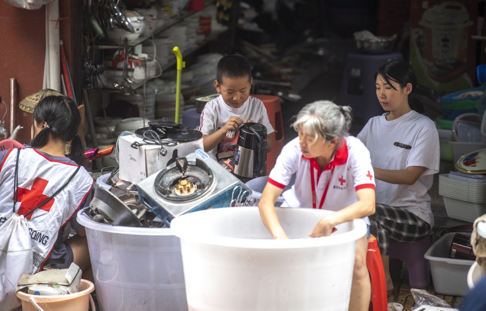 ▲7月6日,万州区五桥街道,居民和志愿者一起清洗商铺里的商品。