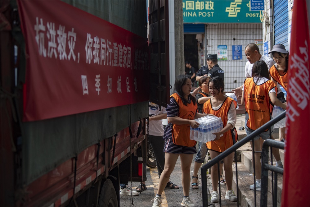 ▲7月6日,万州区五桥街道,社会力量正在搬运救援物资。