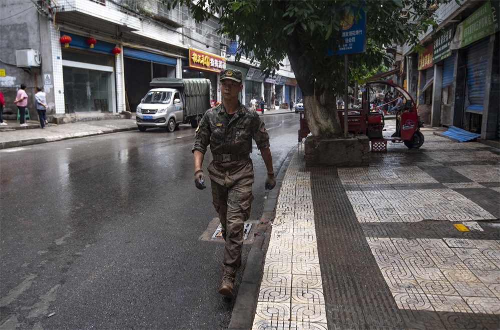 ▲7月6日,万州区五桥街道,一名部队官兵经过清洗后的街道。