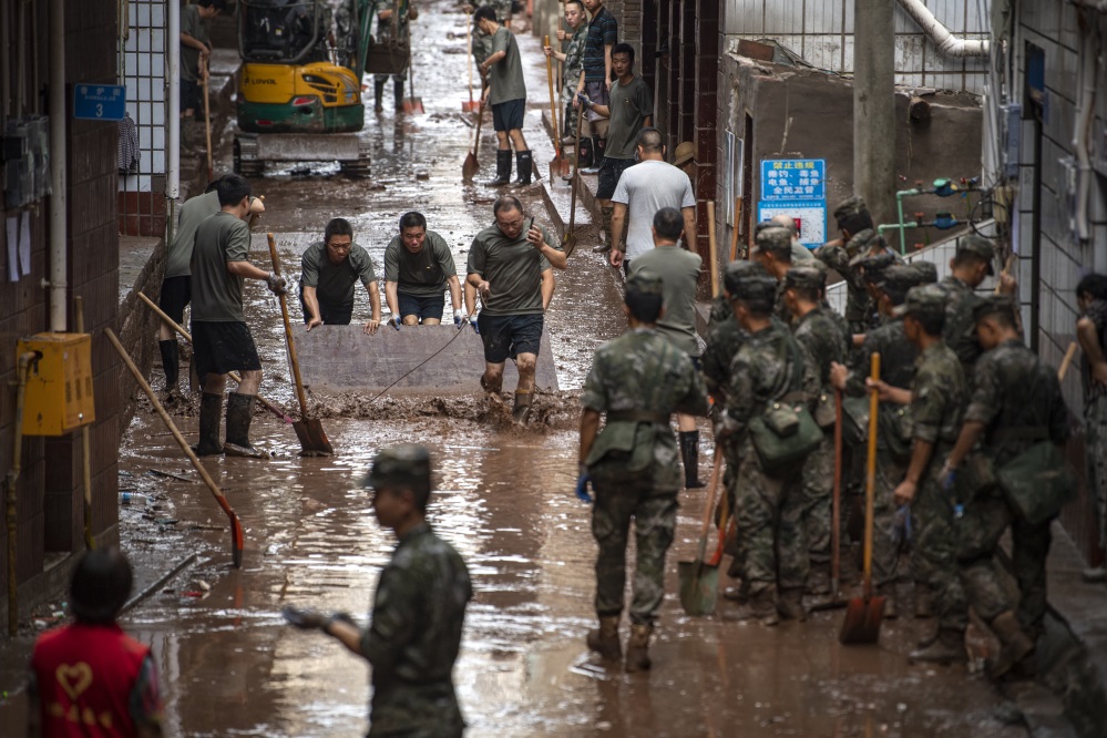 ▲7月6日,万州区五桥街道,战士们正在对最后的淤泥区域进行攻坚作业。
