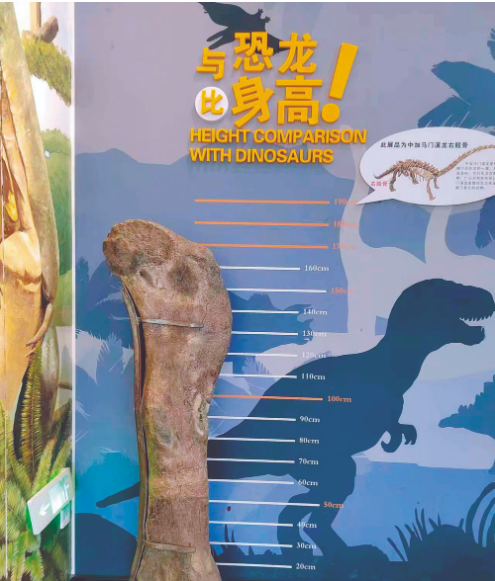 趣1 比高 与恐龙股骨化石肩并肩 潼南博物馆,位于潼南区大佛街道石碾社区,毗邻潼南大佛寺景区,馆内设有5个展厅,首先进入的是恐龙展厅,展厅内陈设有亚洲最大的蜥脚类恐龙化石。 而展厅内部,最有趣的是这个大家伙——“身高一米八”的马门溪龙右股骨。它的旁边还放了身高标识牌,无论男女老少,都可以站在旁边和它比比高。 这是真的恐龙化石还是模型?小刘指着化石上的编号说:“肯定是化石。你看,上面还有编号,查编号就可以了解它出土的地方和时间。它是从潼南出土的。” 这真的是不花钱就可以摸的吗,怎么没有玻璃罩?记者小心翼翼地轻轻摸了一下。小刘说:“这是为了让来参观的观众有更好的体验。恐龙骨已经石化了,非常硬。轻轻摸没有问题。”