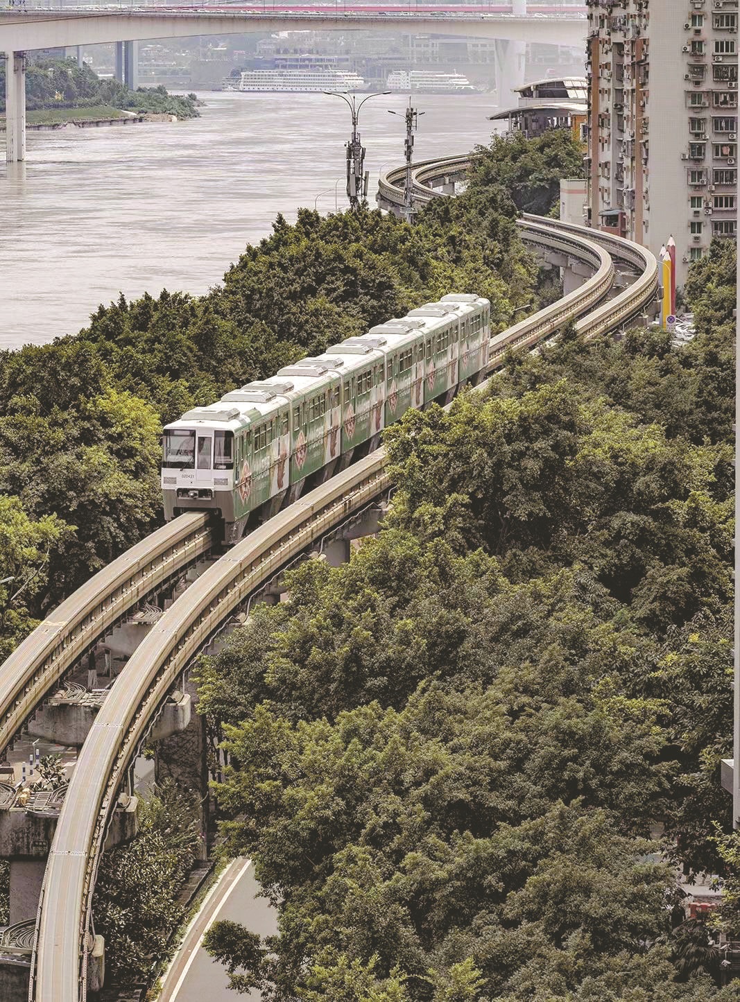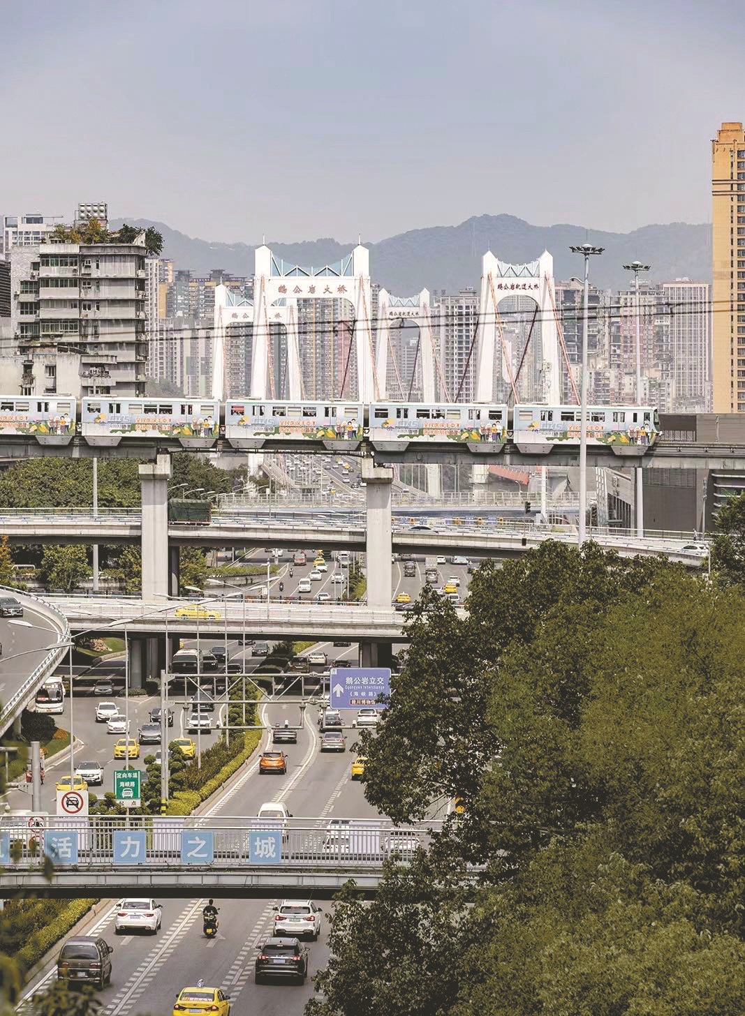 列车从“绿叶丛中”飞驰而过 机位:佛图关站站台 王潇锐称,在佛图关站,可以拍到列车从“绿叶丛中”飞驰而过,机位可选择在站台两侧,找到位置后,静静等待列车的到来;在谢家湾站,则能蹲守到列车与鹅公岩“姊妹桥”的合拍,鹅公岩大桥和鹅公岩轨道大桥相并立,列车从它们面前驶过,再与下方公路的重庆特色“黄色法拉利”合影,三种重庆地标特色的结合,完美展现出重庆的立体交通……