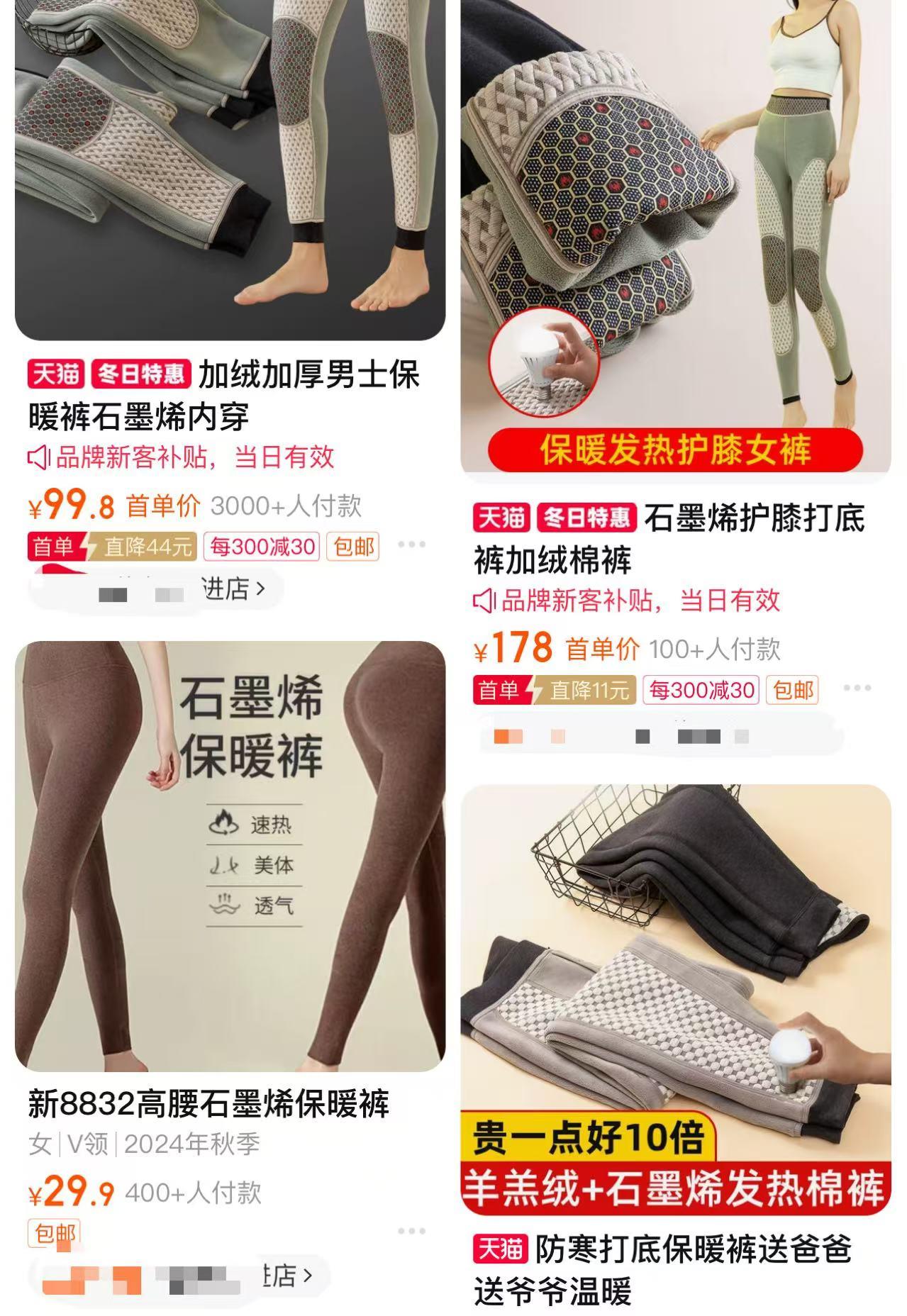 △ 网购平台在售的“远红外”保暖裤 石墨烯?难量产! 同样,石墨烯是碳材料的基本结构单元,是一种纳米材料,具有高强度、高导电性和优异的热传导性能。石墨烯纤维可以制造具有抗菌、除臭、防紫外线等功能的服装。 但石墨烯纺织品造价高、制备工艺要求高,导致其难以量产。每克石墨烯产品价值约1000元,如果完全使用石墨烯制造一件保暖衣,保守估计成本也要上万元。因此,热销几十元、几百元一条的秋衣秋裤中添加的基本都不是真正的石墨烯。