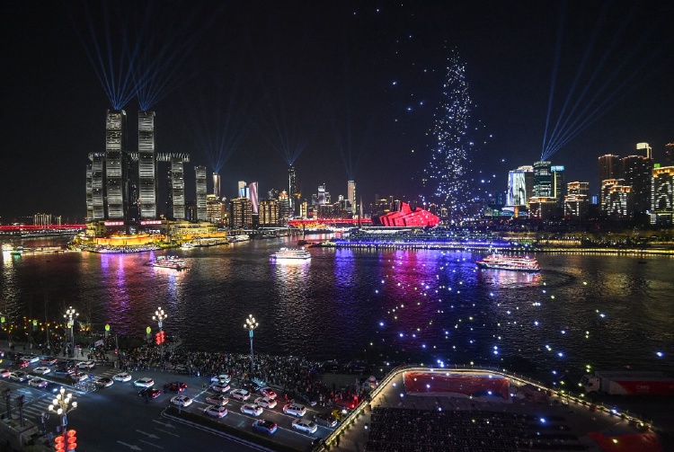 2025年1月26日,南岸区南滨路两江交汇,现场正在表演精彩的无人机灯光秀——中欧班列。记者 齐岚森 摄