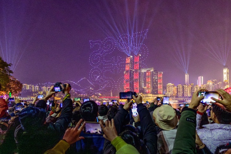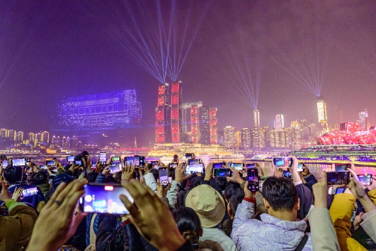 2025年1月27日,南岸区南滨路,市民在拍摄精彩的无人机表演。记者 李雨恒 摄
