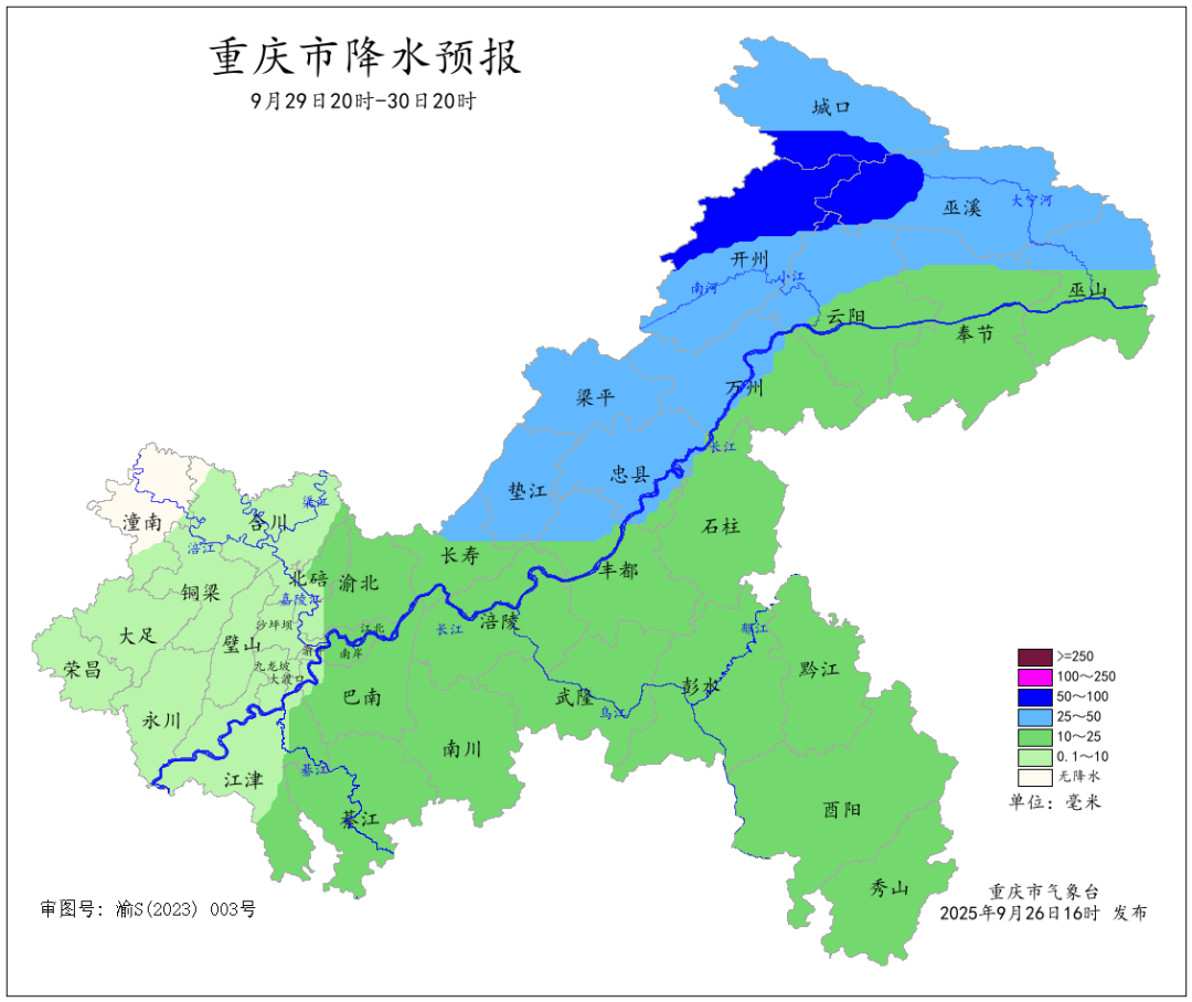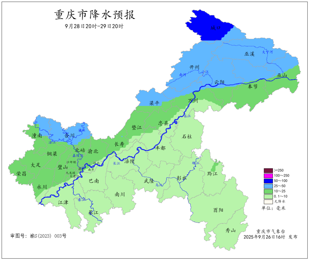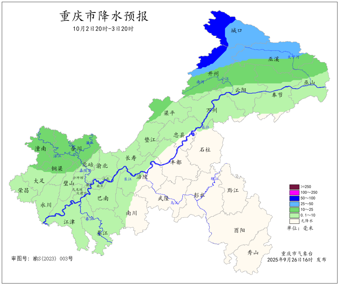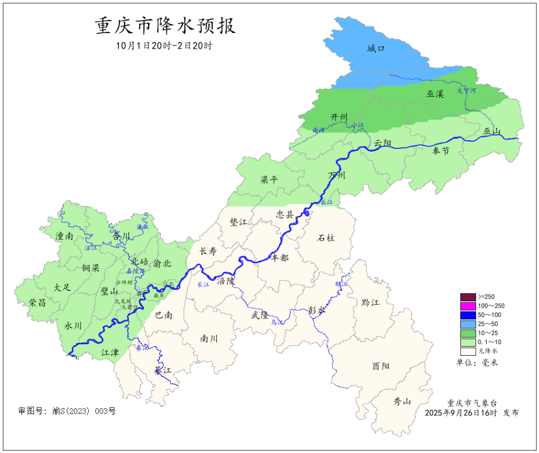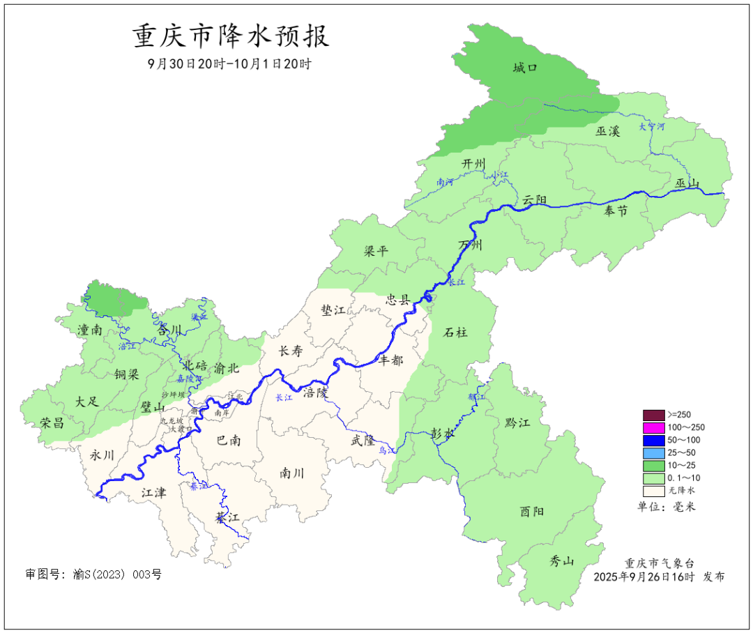 今(26)日18时重庆气象台发布消息,未来一周重庆天气多阵雨,中秋国庆长假期间气温适中,最高气温维持在34℃及以下,市民出游需常备雨具。 重庆市气象台预计,未来一周我市多阵雨,其中9月28日夜间到30日,大部地区中到大雨,东北部局地暴雨;10月2日到3日,长江沿线以北地区小到中雨,东北部局地大到暴雨。 未来一周天气预报 9月26日夜间到27日白天(26日20时—27日20时),大部地区多云间晴,西北部和东部部分地区有阵雨,气温17~33℃;中心城区多云间晴,气温22~32℃。 9月27日夜间到28日白天(27日20时—28日20时),长江沿线以北地区多云转阵雨,局地中雨,其余地区多云间阴天,气温17~33℃;中心城区多云转分散阵雨,气温24~31℃。