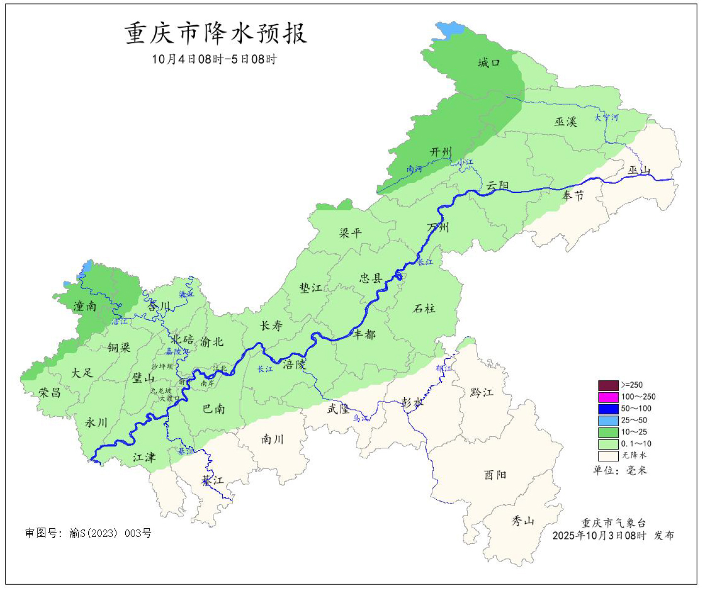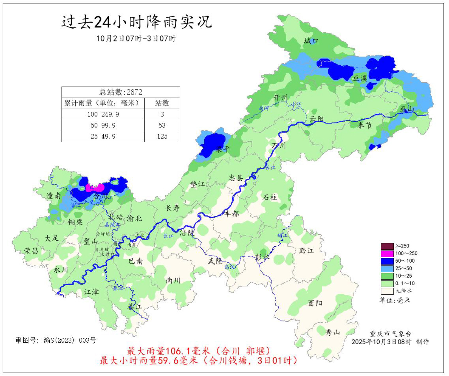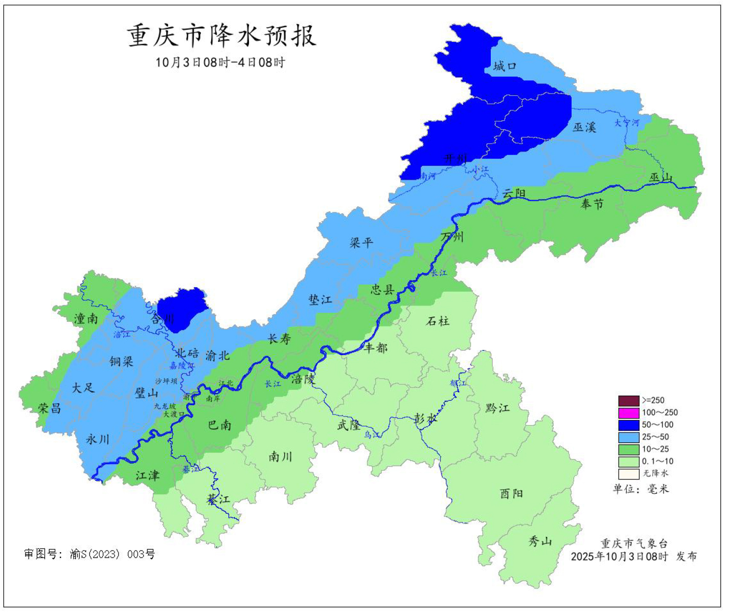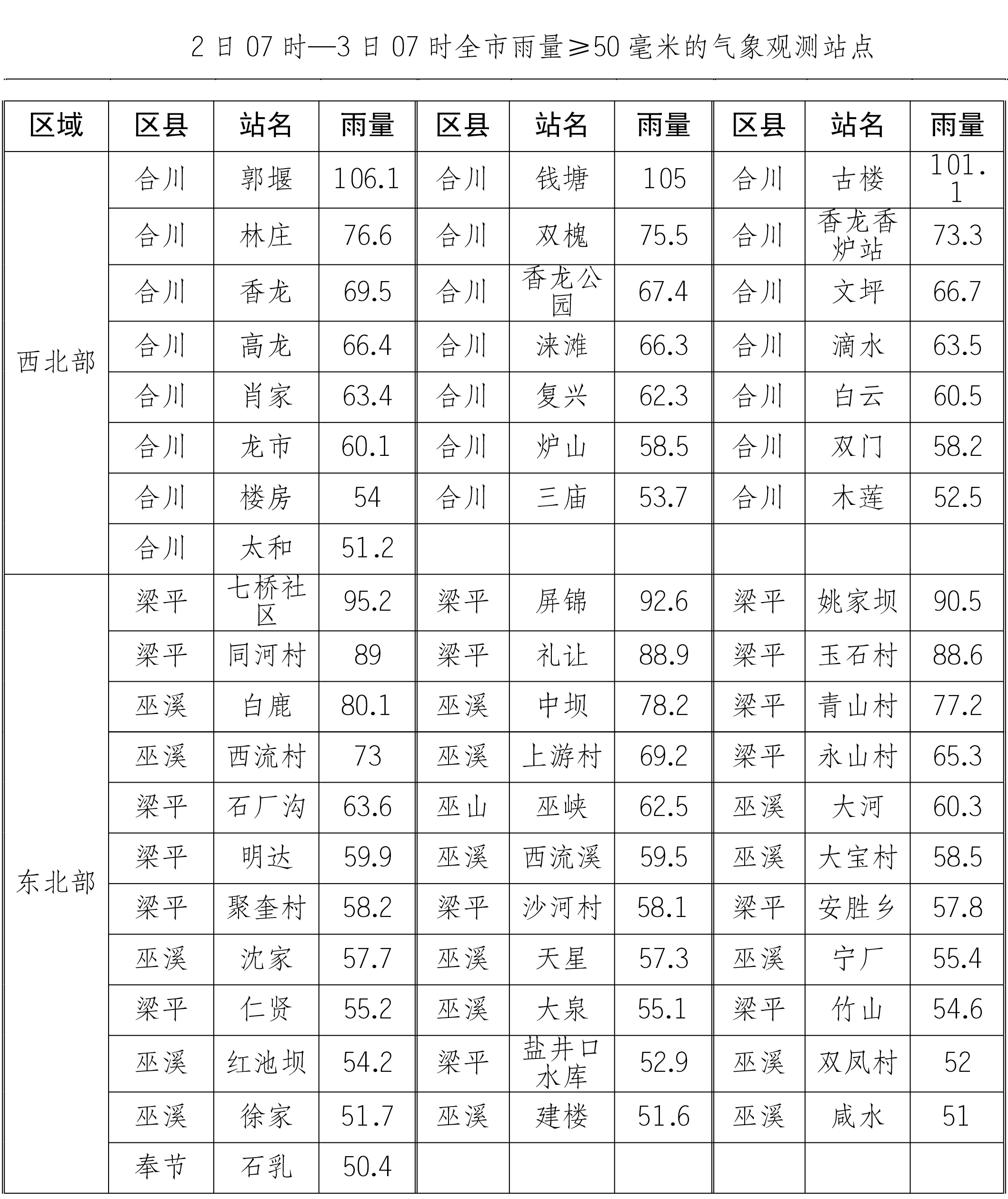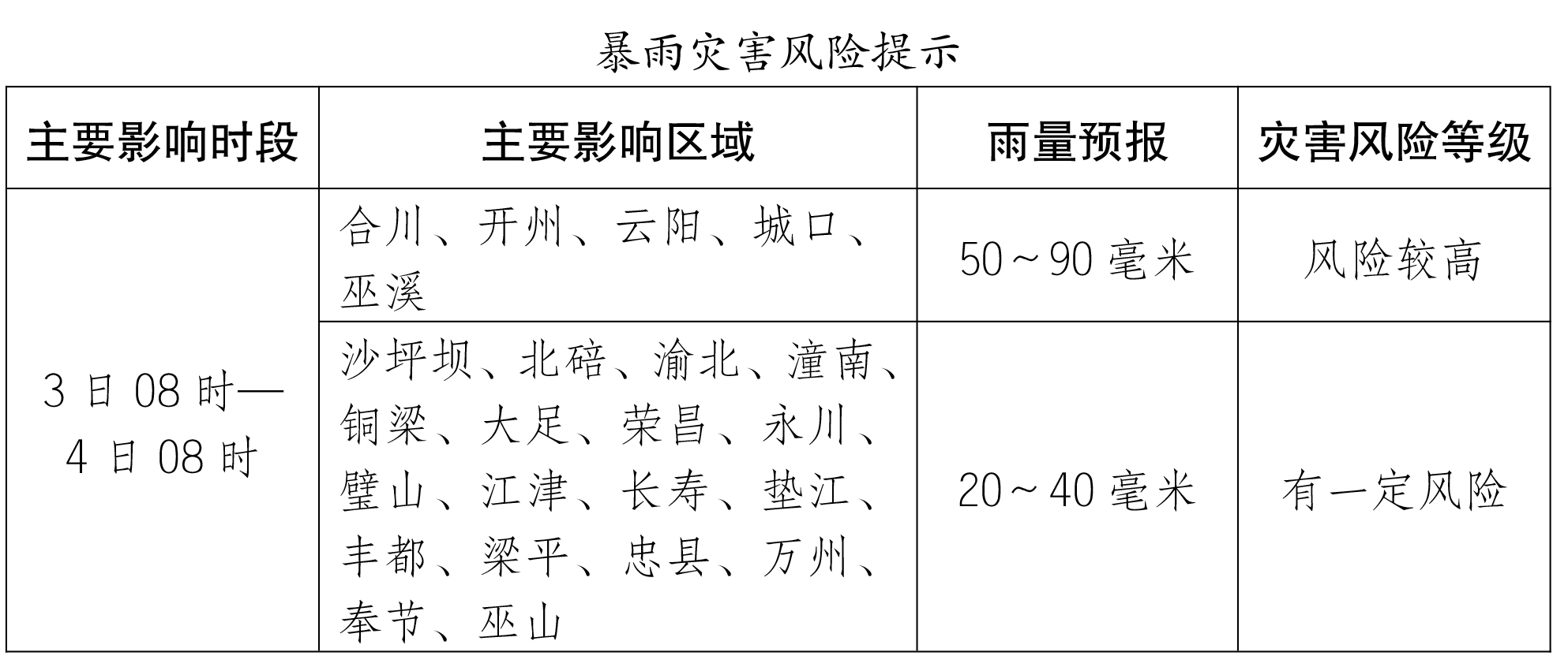 重庆市气象台发布消息,预计3日,长江沿线以北地区中到大雨(20~40 毫米),局地暴雨(50~90 毫米);4日,中西部和东北部地区局地大雨(25~40 毫米);叠加前期降雨影响,东北部和西北部部分地区地质灾害、中小河流洪水气象风险较高,注意防范。5日,大部地区多云到晴。 一、24 小时天气预报及风险提示 3日白天到夜间(3日08时—4日08时),各地阵雨或雷雨,雨量长江沿线以北地区中到大雨(20~40毫米),局地暴雨(50~90毫米),其余地区小雨,气温16~32℃;中心城区分散阵雨转中到大雨(20~40毫米),气温23~29℃。 3日08时—4日08时全市降水预报图 二、48—72小时天气预报 4日白天到夜间(4日08时—5日08时),中西部和东北部地区阵雨或雷雨,雨量小到中雨,局地大雨(25~40 毫米),其余地区阴天到多云,有分散阵雨,气温 16~32℃;中心城区阴天有阵雨,气温24~31℃。 4日08时—5日08时全市降水预报图 5日白天到夜间(5日08时—6日08时),大部地区多云到晴,局地有阵雨,气温17~34℃;中心城区晴间多云,气温25~33℃。 三、昨日天气实况 2日07时—3日07时,我市中西部偏北和东北部地区出现阵雨或雷雨,局地大到暴雨,个别乡镇大暴雨,合川的3个雨量站达大暴雨,合川、梁平、奉节、巫溪、巫山等5个区县的53个雨量站达暴雨,最大雨量106.1毫米(合川郭堰),最大小时雨量59.6毫米(合川钱塘,3日01时);其余地区阴天到多云,有分散阵雨。 2日07时—3日07时全市雨量分布图 编辑:陶冶 校审:廖雪源 总值班:严一格 |