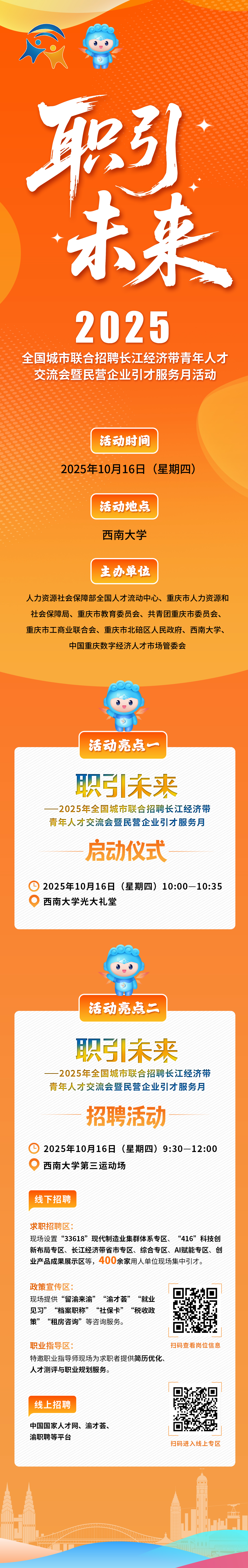 一场服务长江经济带青年人才就业的全国性盛会即将在山城拉开帷幕。10月14日,记者从活动主办方获悉,“职引未来—2025年全国城市联合招聘长江经济带青年人才交流会暨民营企业引才服务月”将于10月16日(本周四)在西南大学盛大启幕。届时,400余家来自市外及重庆本地的重点企业将齐聚现场,释放超过1.3万个优质岗位。 本次活动由人力资源社会保障部全国人才流动中心牵头,联合重庆市人社局、教委、团委、工商联、北碚区政府、西南大学及中国重庆数字经济人才市场管委会共同主办,旨在推动人才与产业深度融合,重点服务2025届、2026届高校毕业生及往届离校未就业青年。 据悉,启动仪式将于10月16日上午在西南大学光大礼堂举行。届时,来自深圳、厦门、苏州、南京、福州等地及市内共400余家重点企业将现场释放人才需求1.3万余个,覆盖从专科至博士各学历层次,广泛涉及制造、医药、科技、金融等多个领域,为青年人才提供丰富多元的就业选择。 同步在第三运动场开启的招聘活动以“精准、多元、便捷”为核心,现场划分五大特色专区——聚焦重庆“33618”现代制造业集群的产业专区、服务“416”科技创新布局的科技专区、推动区域协同的长江经济带省市专区、覆盖全行业的综合招聘专区,以及展示前沿项目的创新创业成果展区,实现人才与岗位高效匹配。 活动现场创新设立“一站式”服务矩阵,为毕业生提供全流程就业赋能。政策宣传区集中解读“留渝来渝”“渝才荟”等政策礼包,涵盖就业见习补贴、职称评定、社保卡申领、税收减免及租房优惠等关键支持;职业指导区由资深导师坐镇,提供简历优化、人才测评及一对一咨询,直击求职痛点;AI赋能专区则凭借“虚拟面试官”技术成为亮点,高度还原多行业真实面试场景,帮助青年提前演练、优化表达策略,提升求职竞争力。 为打破时空壁垒,所有岗位信息将同步上线中国国家人才网、“渝才荟”“渝职聘”等平台,开启线上招聘通道。全国青年人才均可远程投递简历、参与对接,形成“线下精准对接+线上持续引流”的双轨引才模式。“此次活动不仅是岗位的汇聚,更是服务能级的升级。”重庆市人社局相关负责人强调,“通过分区匹配、AI技术和政策集成,我们致力于降低青年求职成本,为长江经济带高质量发展注入新动能。” 撰稿:张馨允 市人力社保局供图 编辑:蒋丽霞 审核:何英 主编:罗再芳 |