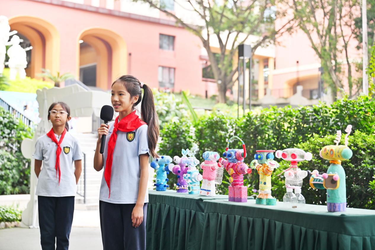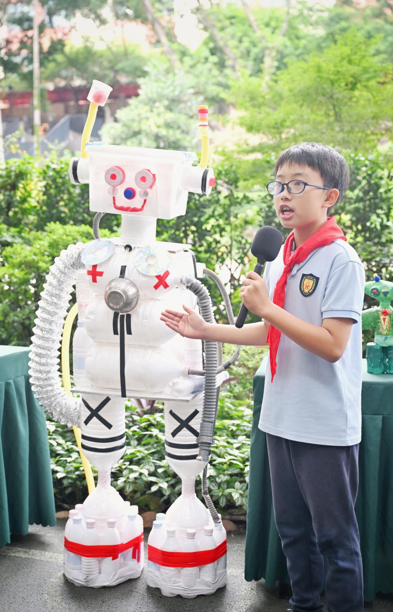 “为什么我们这样看重垃圾分类?”又一个新的问题摆在慕明巍面前。“举个例子,如果去矿山挖矿冶炼,会造成严重的环境污染;可要是把废旧的金属收集起来重新利用,就会大大增加经济效益和减轻环境污染。”慕明巍解释了垃圾分类的重要性。 把旧物改成艺术 孩子们的机器人登场 在校园里的旧物改造展示区,一排色彩丰富、造型各异的“机器人”站成了一排。据了解,这都是该校孩子们利用业余时间,用塑料饮料瓶、纸杯、光碟、旧收纳箱等改造而来。孩子们不仅设计了这些“机器人”,还给它们取了名字并想象了使用场景。