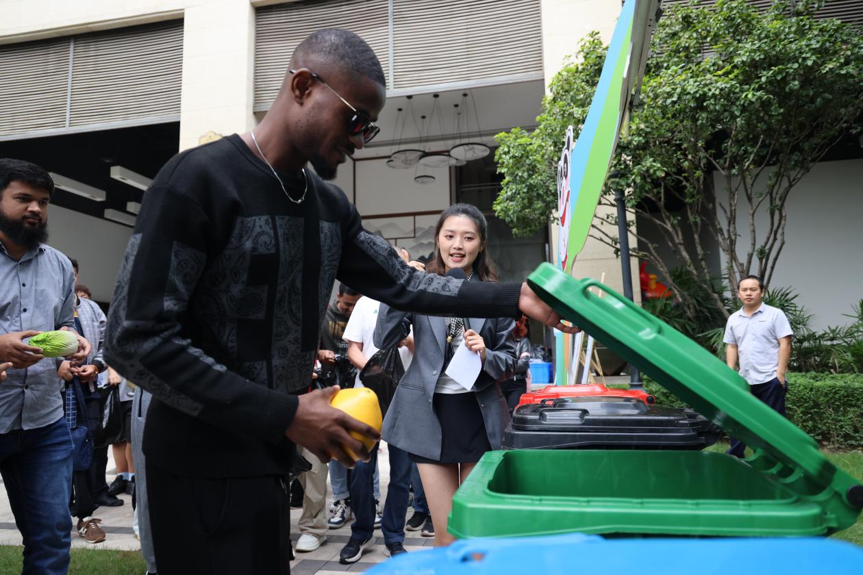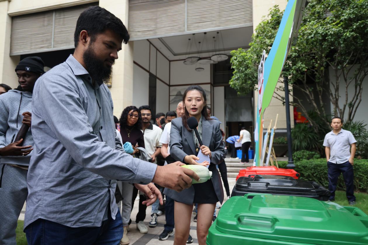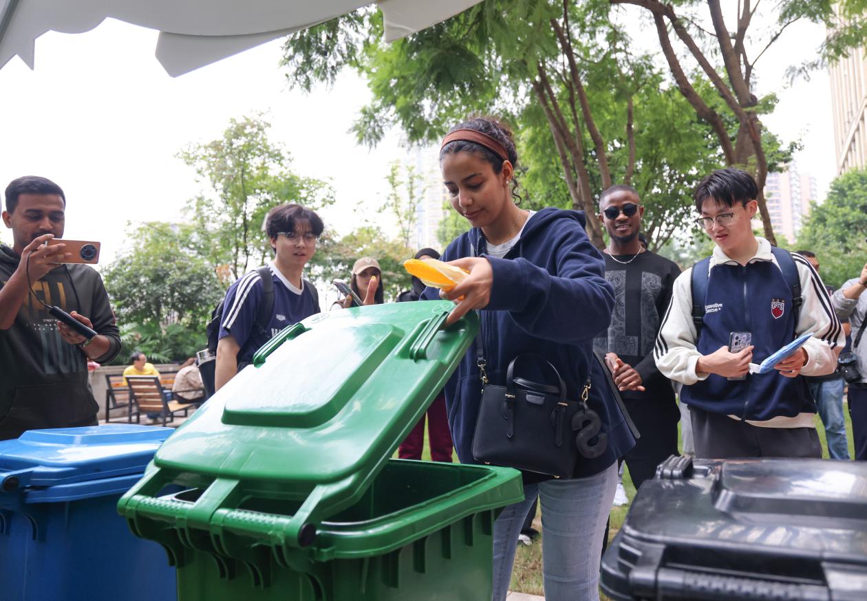 “我来试试!”来自重庆交通大学的留学生们率先上前,拿起一个塑料瓶毫不犹豫地投进可回收物桶,又仔细看了看手中的香蕉皮,准确放进厨余垃圾桶。“刚才课堂上学的都用上了,特别有成就感!”这名留学生笑着说。