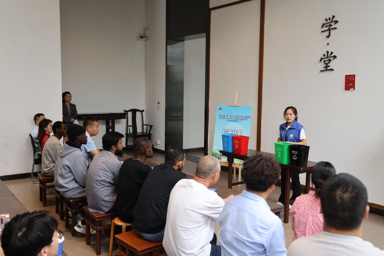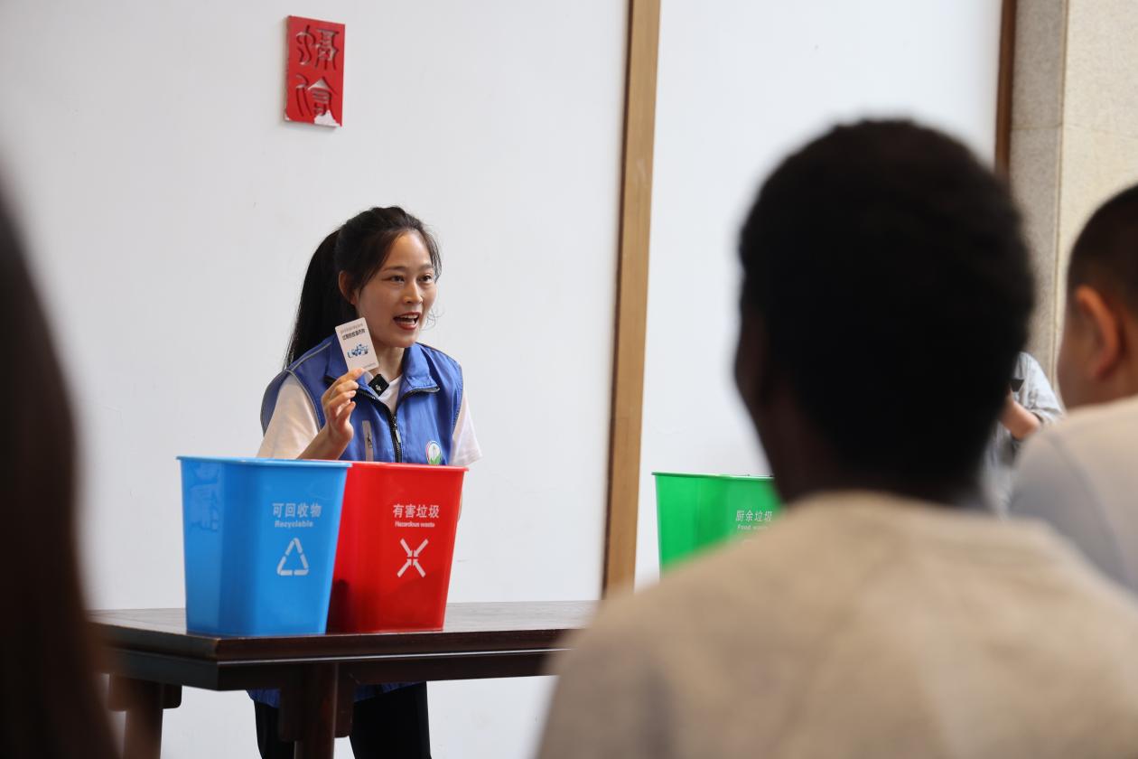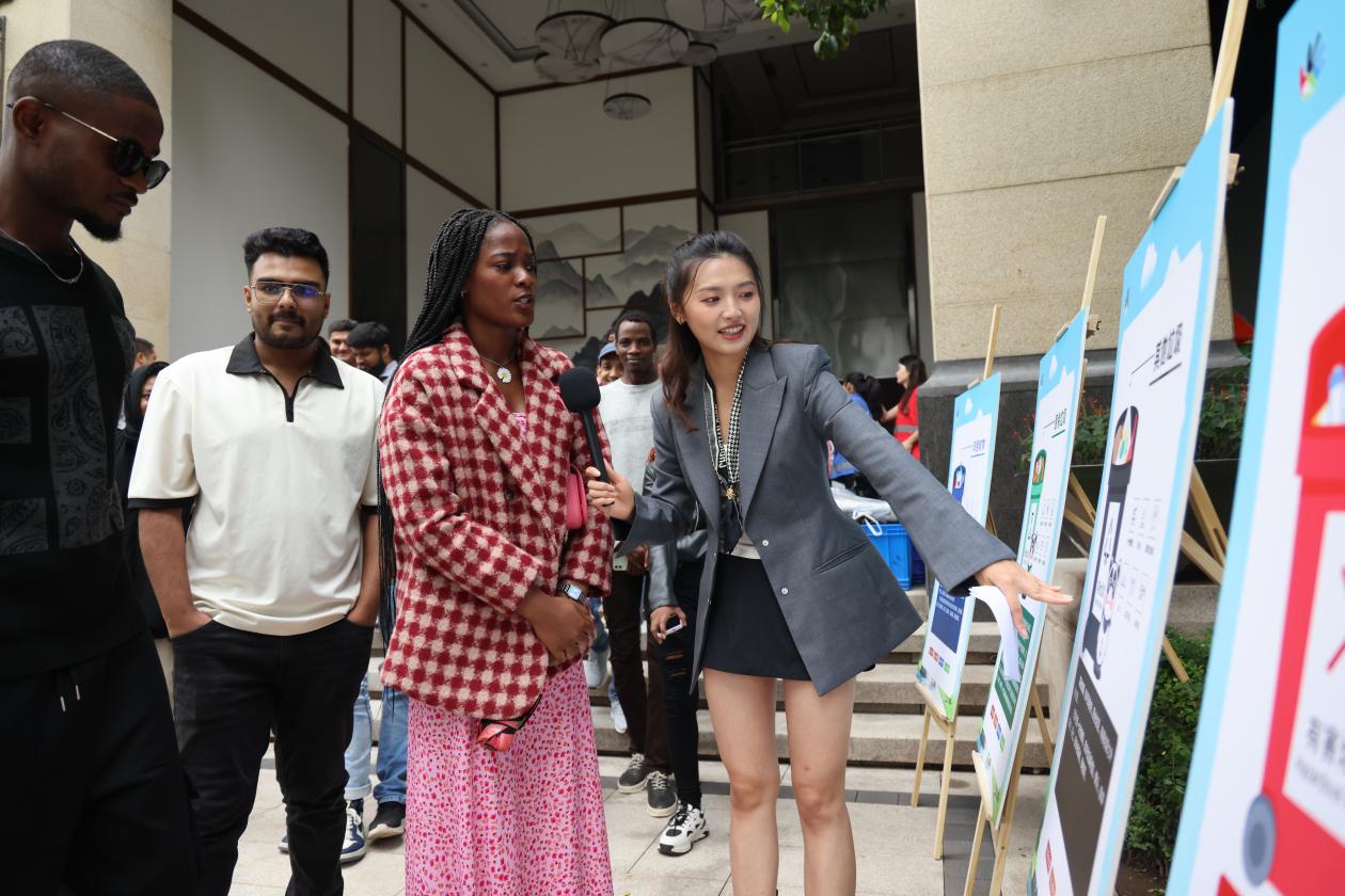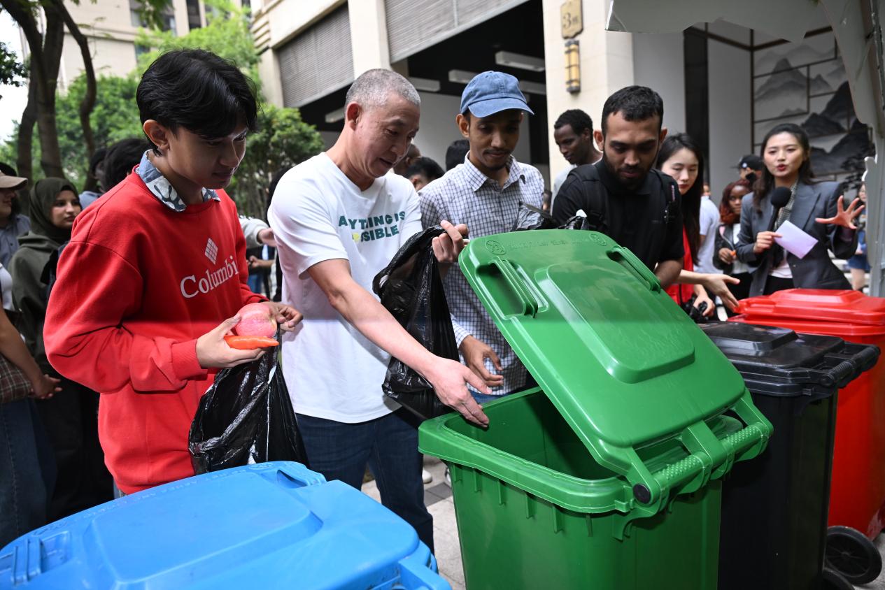 “我来试试!”来自重庆交通大学的留学生们率先上前,拿起一个塑料瓶毫不犹豫地投进可回收物桶,又仔细看了看手中的香蕉皮,准确放进厨余垃圾桶。“刚才课堂上学的都用上了,特别有成就感!”这名留学生笑着说。