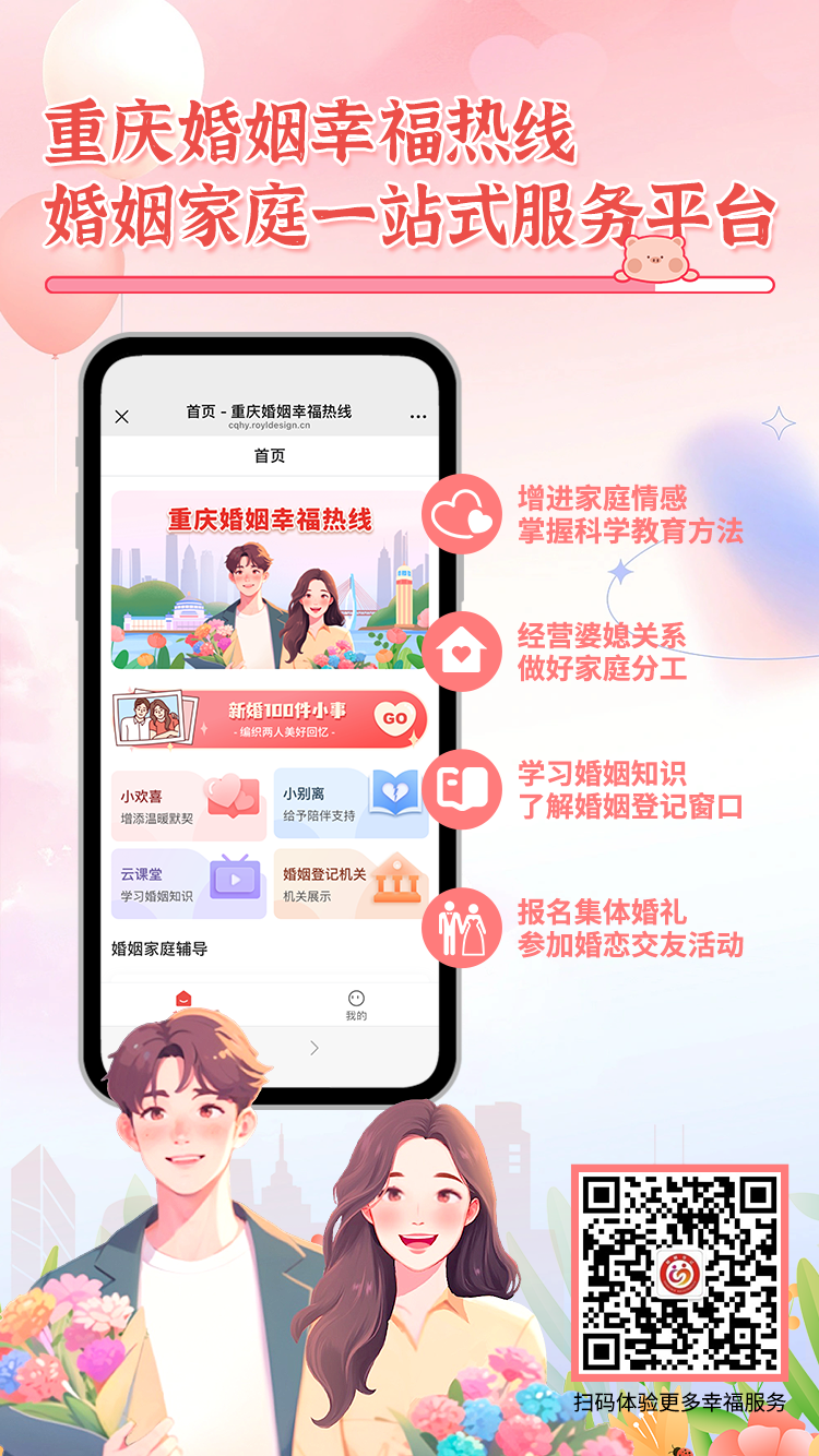 仪式感拉满 许下秋日约定 活动现场,飘散着淡淡的桂花香味,“心缘墙”前围满了人。每位青年可匿名投递3张心意卡,有人写下“喜欢你的笑声”,有人画下简笔画蛋糕,更有技术员用代码符号铺成一幅爱心图案。 每一张心意卡都承载着一份期待。当夕阳为“理想小家”模型镀上金边时,不少人已互留联系方式。更有多位嘉宾,在现场热烈的氛围中勇敢表白。 “青年的婚恋幸福是城市温暖的底色。”作为“婚育新风尚,幸福向未来”重庆市婚俗改革宣传周的市级主要活动之一,“家和遇见爱”婚恋交友活动正是婚育新风尚注入青春活力的体现。 据悉,“重庆婚姻幸福热线”小程序也在当天(18日)正式上线,后续还将推出更多的婚恋交友活动,为青年朋友提供安心、舒心、放心的交友平台,持续为“幸福恋爱”助力。 活动尾声,十余个新组建的“拼图小队”“甜品联盟”微信群非常活跃,有人相约周末爬山,有人计划参加读书会。正如一位参与者所说:“今天不仅可能遇见爱情,更找到了同频的伙伴。这种‘不设限’的社交,才是年轻人需要的。” 重庆婚姻幸福热线小程序 今日正式上线 新婚盲盒、云课堂、一对一辅导……重庆婚姻幸福热线小程序超多玩法上线。 据了解,“重庆婚姻幸福热线”小程序构建了新婚100件小事、“小欢喜”“小别离”、云课堂、婚姻登记机关、幸福定制坊、幸福心声收集卡等应用场景,用户还可通过热线电话、预约辅导进行一对一的婚姻家庭辅导服务。 更多海量婚恋干货、好玩的互动活动、定制专属服务,用户可关注“重庆婚姻幸福热线”服务号,解锁更多幸福体验。