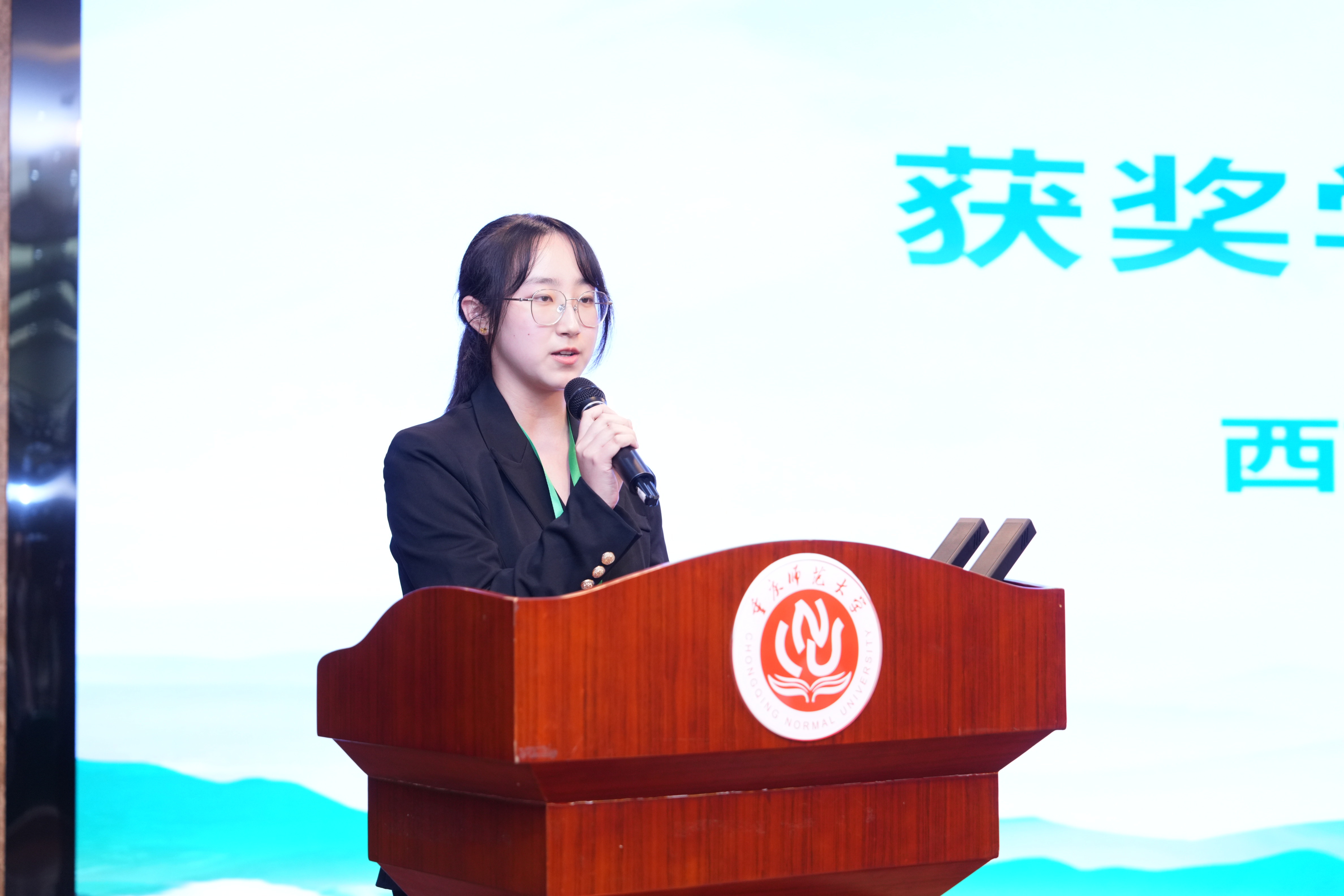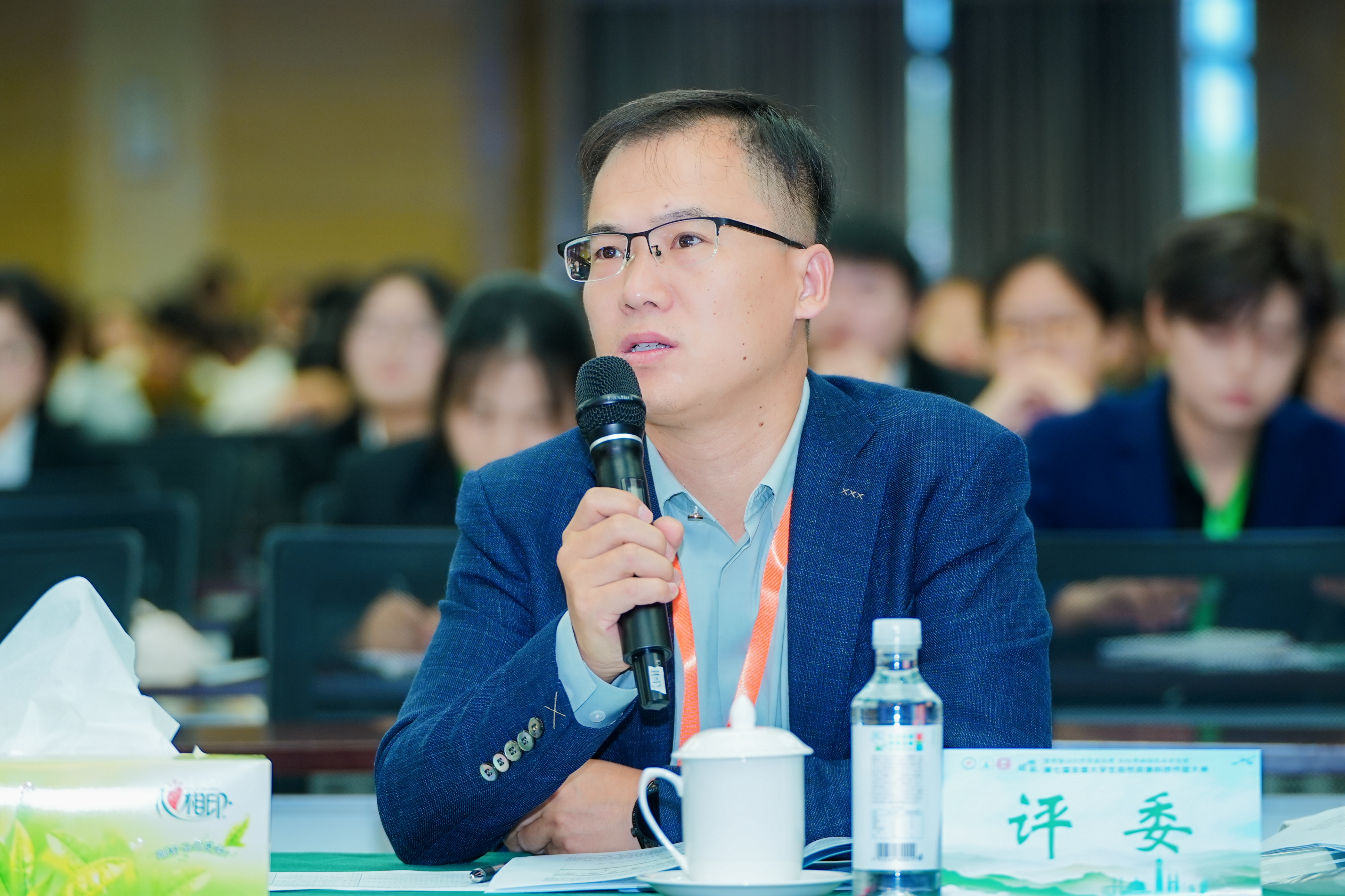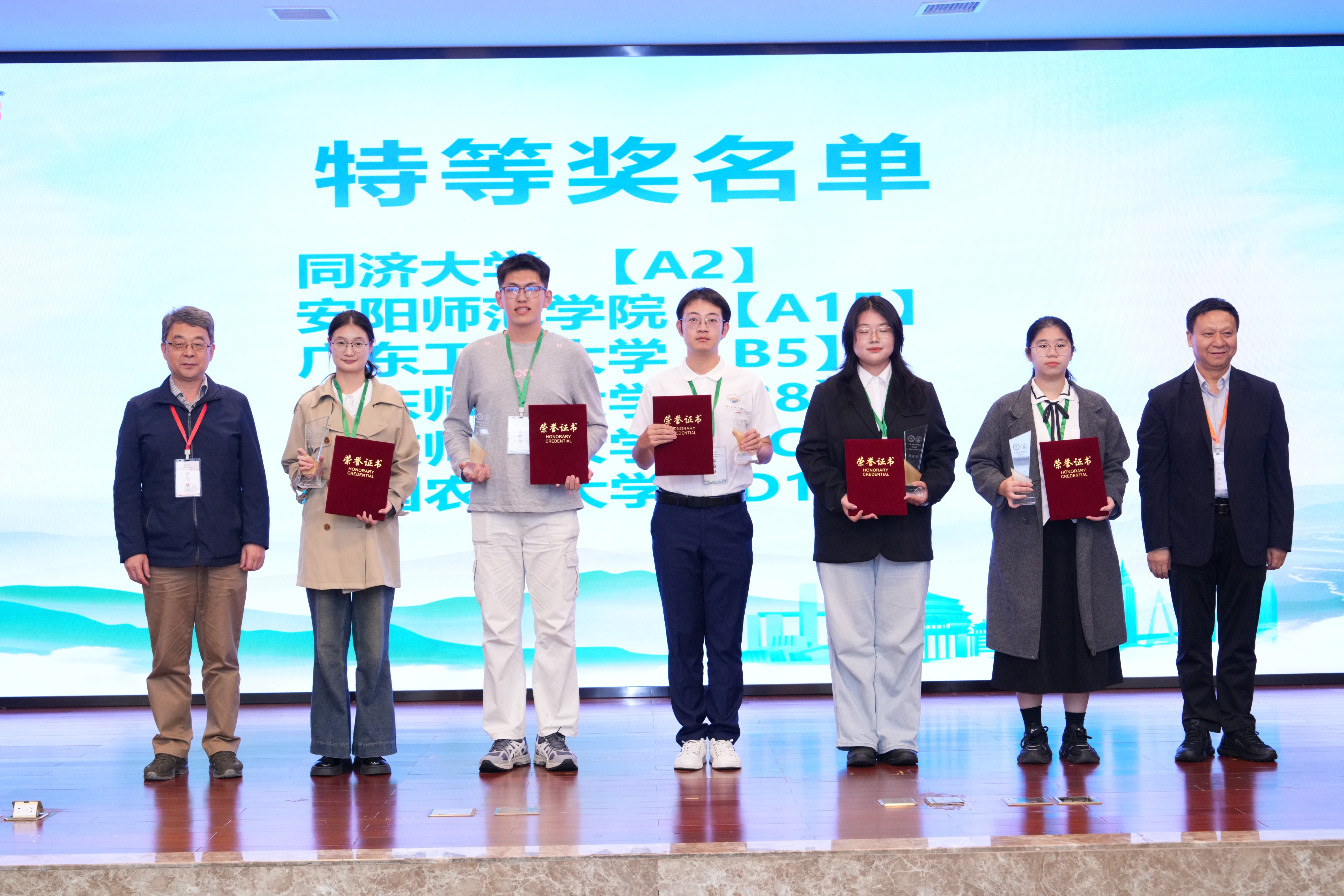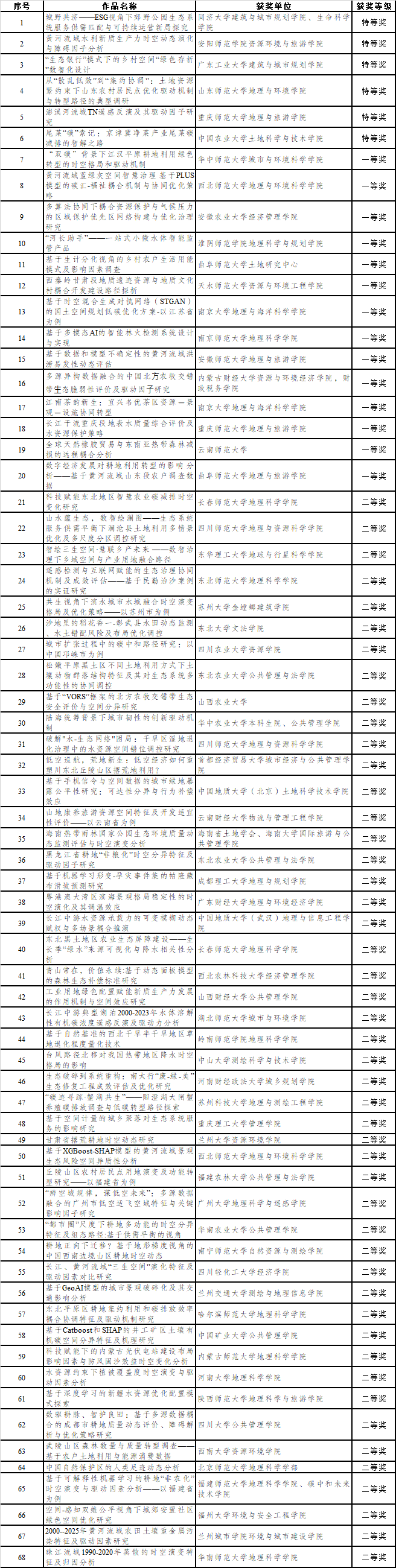 大赛评审组点评 闭幕式:硕果累累,传承科创精神 大赛评审组副组长、西南大学涂建军教授在综合点评中指出,本届参赛作品整体呈现出“数智化”程度高、交叉性强、应用前景广的特点,充分肯定了各团队对大赛主题的深刻理解和卓越实践,并向获得各项大奖的老师同学们表示祝贺。 颁奖仪式上,大赛评审组宣布获奖名单,并为获奖队伍颁奖。6支队伍获特等奖,14支队伍获一等奖,48支队伍获二等奖,10家单位获优秀组织奖,10支队伍的指导老师获优秀指导教师奖。指导教师代表曾春芬教授在发言中分享了如何引导学生以“科技”的画笔,描绘“绿色未来”的宝贵经验。获奖学生代表何思莹表示本次大赛让他们更加坚定了运用所学知识服务自然资源治理现代化的决心。