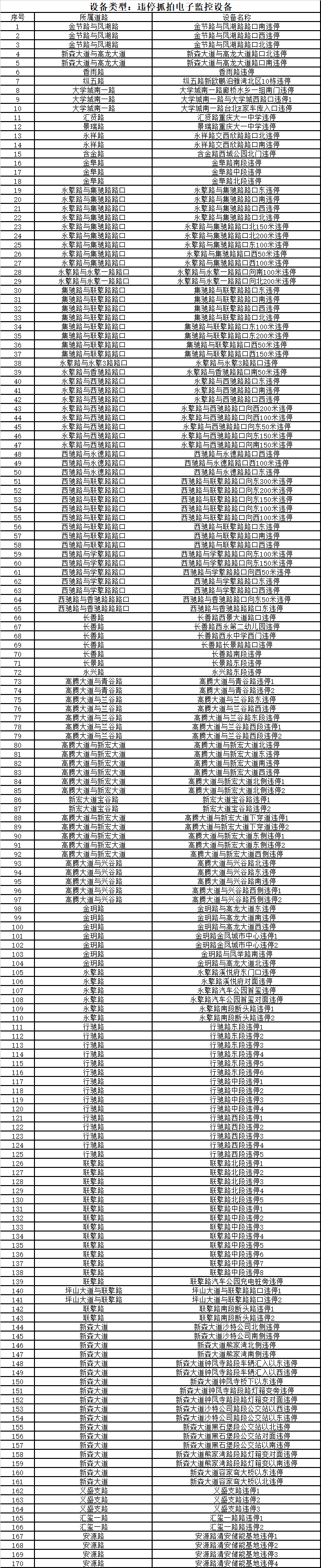 为进一步强化交通安全管理,规范道路通行秩序,建立安全文明畅通的交通环境,根据《中华人民共和国道路交通安全法》《中华人民共和国道路交通安全法实施条例》等相关法律规定,现将我区新增电子执法设备情况及点位向社会进行公告,请广大交通参与者遵守道路交通安全法规,安全文明出行。 重庆市公安局高新区分局 2025年10月16日 违停抓拍电子监控设备(170套) 抓拍违法行为:1.机动车违反停放、临时停车规定;2.机动车在设置“严管路段”“消防车通道”以及应急、救援、抢险救护等生命通道标识区域和路段违反停放、临时停车规定的。