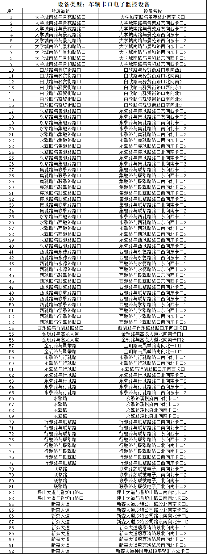 车辆卡口电子监控设备(92套) 抓拍违法行为:1.驾驶时拨打、接听手持电话;2.机动车违反禁令标识指示;3.在高速公路或城市快速路以外的道路上行驶时,驾驶人未按规定使用安全带。