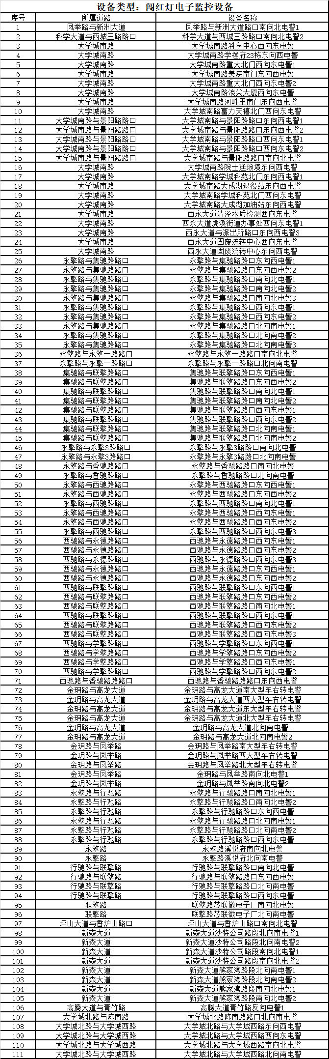 闯红灯电子监控设备(111套) 抓拍违法行为:1.驾驶机动车违反道路交通信号灯通行;2.机动车通过有灯控路口时,不按所需行进方向驶入导向车道;3.驾驶机动车在高速公路、城市快速路以外的道路逆向行驶;4.机动车违反禁止标线指示的。