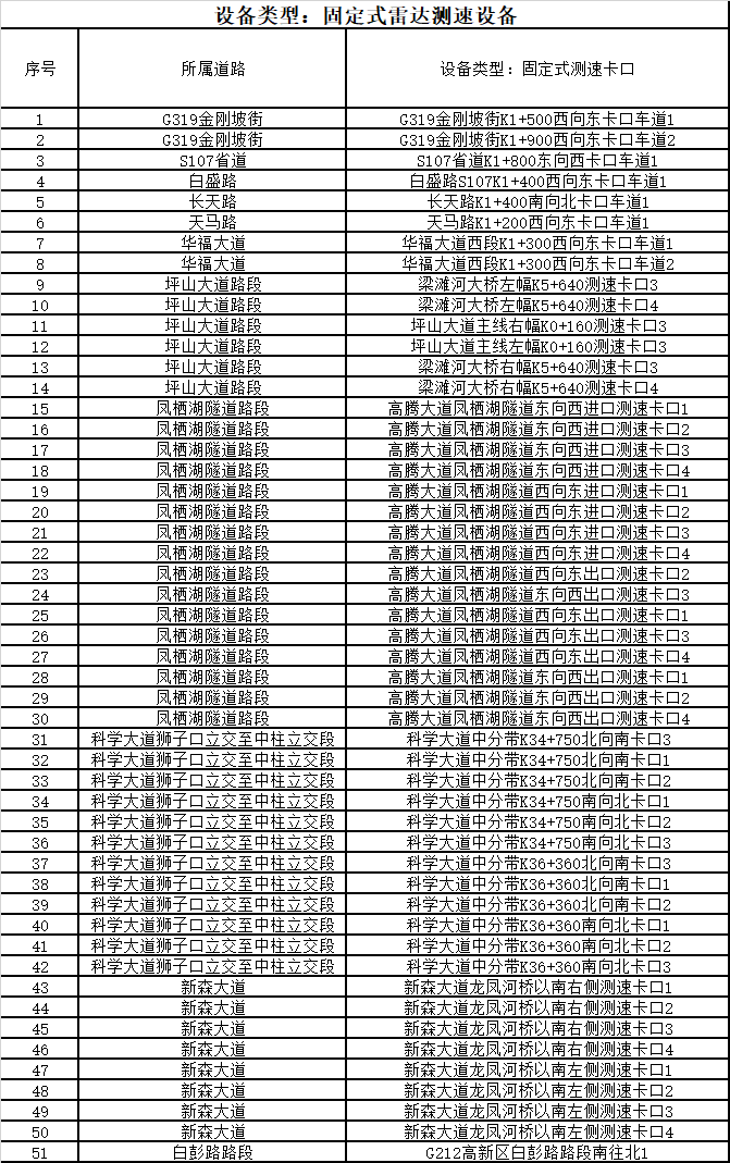 固定式测速电子监控设备(51套) 抓拍违法行为:驾驶机动车在普通公路、城市快速路等道路上行驶超过规定时速。