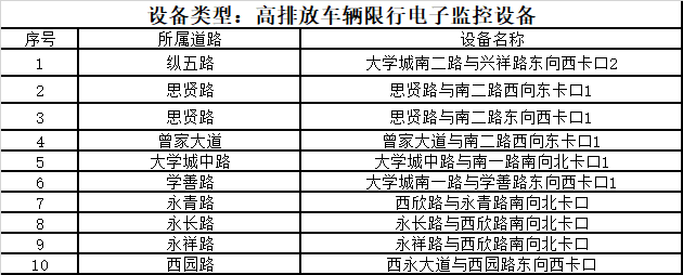 高排放车辆限行电子监控设备(10套) 抓拍违法行为:高排放车辆违反限行规定行驶的。