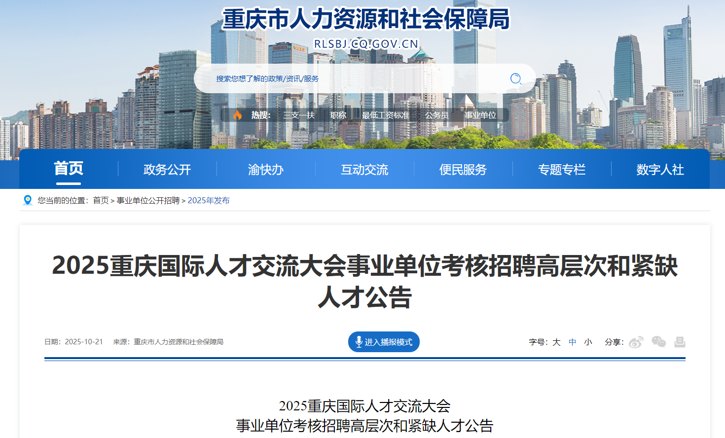 10月21日,重庆市人力资源和社会保障局发布《2025重庆国际人才交流大会事业单位考核招聘高层次和紧缺人才公告》(以下简称公告)。 公告称,为优化人才结构,加强事业单位人才队伍建设,根据《事业单位人事管理条例》(国务院令第652号)等规定,按照重庆国际人才交流大会组委会工作部署,决定考核招聘一批事业单位高层次和紧缺人才。本次考核招聘坚持公开、平等、竞争、择优原则,按照德才兼备、以德为先的标准,采取考试与考核相结合的方式进行。 公告称,本次考核招聘事业单位工作人员2443名。记者注意到,本次考核招聘的形式有不组织公共科目笔试、达到8:1报考竞争比需参加公共科目笔试等,考核招聘单位有重庆市发展和改革委员会、重庆市教育委员会、重庆市住房和城乡建设委员会、重庆市经济和信息化委员会、重庆市人力资源和社会保障局、重庆市农业农村委员会、重庆市文化和旅游发展委员会、重庆市商务委员会、重庆市卫生健康委员会、重庆市退役军人事务局、重庆市市场监督管理局、重庆市规划和自然资源局、重庆社会科学院等。 新闻链接:2025重庆国际人才交流大会事业单位考核招聘高层次和紧缺人才公告 原标题:2443人!重庆事业单位考核招聘高层次和紧缺人才 编辑:蒋丽霞 校审:罗再芳 总值班:杨飞