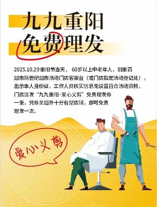 以百年,庆重阳,第六届百年重百购物节火热进行中 在重阳节即将到来之际,重百新世纪超市推出浓浓敬老情“九九重阳·爱心义剪”公益活动,10月29日当天,重百新世纪超市将在多家门店为60岁以上老年人提供免费、便捷的理发服务,传递企业对老年人的关爱和温暖,弘扬尊老敬老的传统美德。同时部分重百新世纪超市门店将开展重阳节品茶互动活动,顾客可在活动区域免费品尝菊花茶、重阳糕。周末活动期间超市精选出多款适合中老年的礼盒,其中汤臣倍健尊耀蛋白粉礼盒420g+300g,促销价358元,东阿阿胶桃花姬玫瑰阿胶糕(160g)折后价仅需198元,欢迎到重百新世纪超市各门店选购。