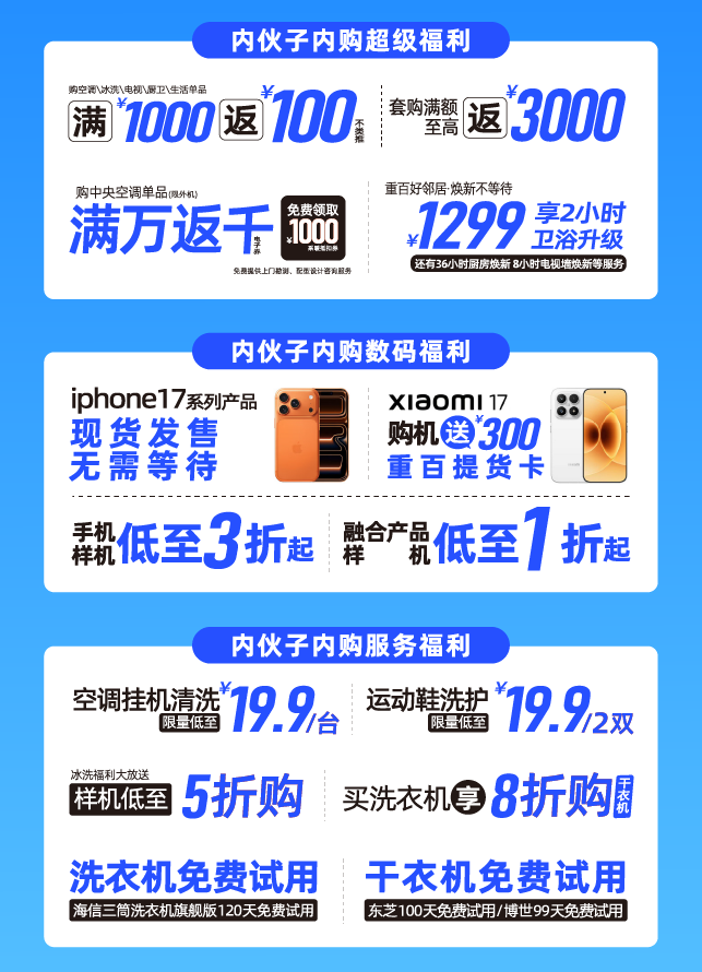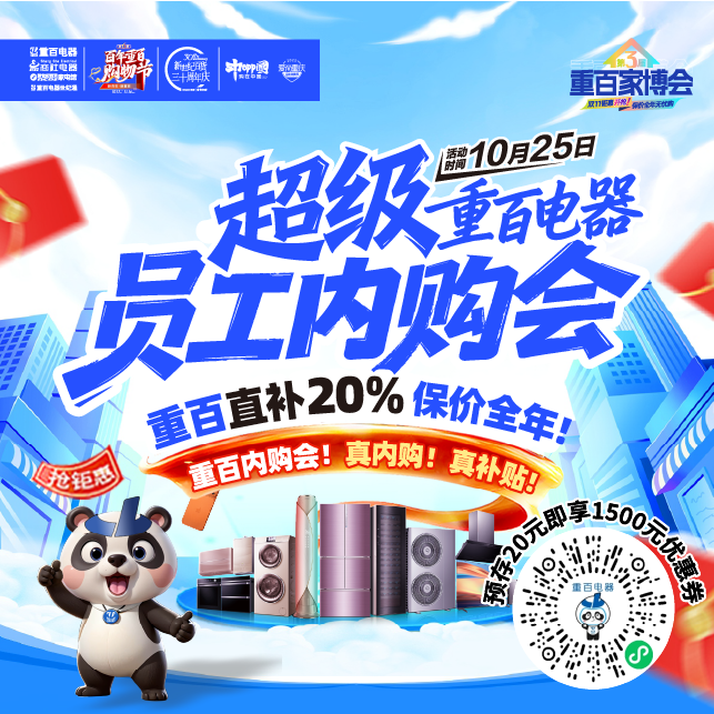 重百电器内购会直补20%万人响应 首周燃爆山城 10月25日,重百电器内购会即将开启,活动反响热烈,首周报名人数已突破万人,内购会以“直补20%,保价全年”为特色,推出多项实质性福利。消费者预存20元即可获得1500元优惠券;购买空调、冰洗、电视等单品满1000元返100元,套购满额最高返现3000元;中央空调外机享受“满万返千”优惠,并赠送价值1000元的上门勘测与设计服务,切实解决安装难题。还有冰洗样机5折购,洗衣机、干衣机支持免费试用等体验服务。 数码产品方面惊喜不断:iPhone17系列全线现货首发,实现“即看即买”;购买小米17即赠300元提货卡;手机样机低至3折,融合产品样机更享1折起特惠。服务层面展现十足诚意:空调挂机清洗、运动鞋洗护限量特惠19.9元,针对家庭局部旧改需求日益旺盛的情况,另推出1299元专享2小时卫浴升级等快速旧改焕新服务,提升居家生活品质。 重百员工内购会,不只是一场购物盛宴,更是服务与品质的双重体验。期待您的参与,共同沉浸在这场家电福利满满的内购盛会之中。