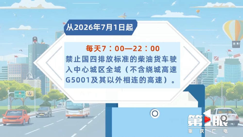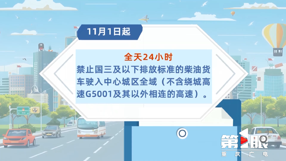 日前,市生态环境局、市公安局、市交通运输委联合发布《关于优化调整高排放柴油货车限行措施的通告》(以下简称《通告》),自11月1日起,重庆将优化调整中心城区高排放柴油货车限行措施。 《通告》规定,11月1日起,全天24小时禁止国三及以下排放标准的柴油货车驶入中心城区全域(不含绕城高速G5001及其以外相连的高速)。从2026年7月1日起,每天7:00—22:00禁止国四排放标准的柴油货车驶入中心城区全域(不含绕城高速G5001及其以外相连的高速),全天24小时禁止国四排放标准的柴油货车驶入中心城区内环快速路及以内区域。军车、警车、消防车、工程救险车和中国邮政专用车不在限行对象范围内。