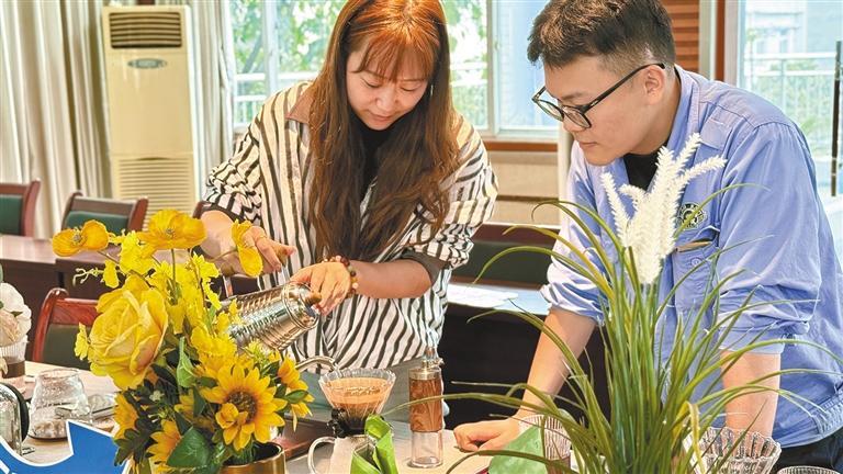 活动伊始,“咖啡盲盒分组”率先打破陌生感——大家抽取印着柑橘调、坚果调等不同风味的卡片,相同者自动组队。 各组推选“咖啡队长”,领取任务手册后,“咖啡味觉猜猜乐”接力升温:蒙眼品尝多种咖啡液,凭酸度、甜感猜豆种。 猜对的小组成员们欢呼雀跃,收获优先选豆权。 拉花艺术,勾勒美好时光 随后,在专业咖啡师的指导下,青年们开始了手冲咖啡的探索。 大家分工合作,渐渐掌握了四段式注水法的精髓。设置的“意外环节”更是增添了趣味性——随机调换组员一分钟,考验着临时组建的默契。