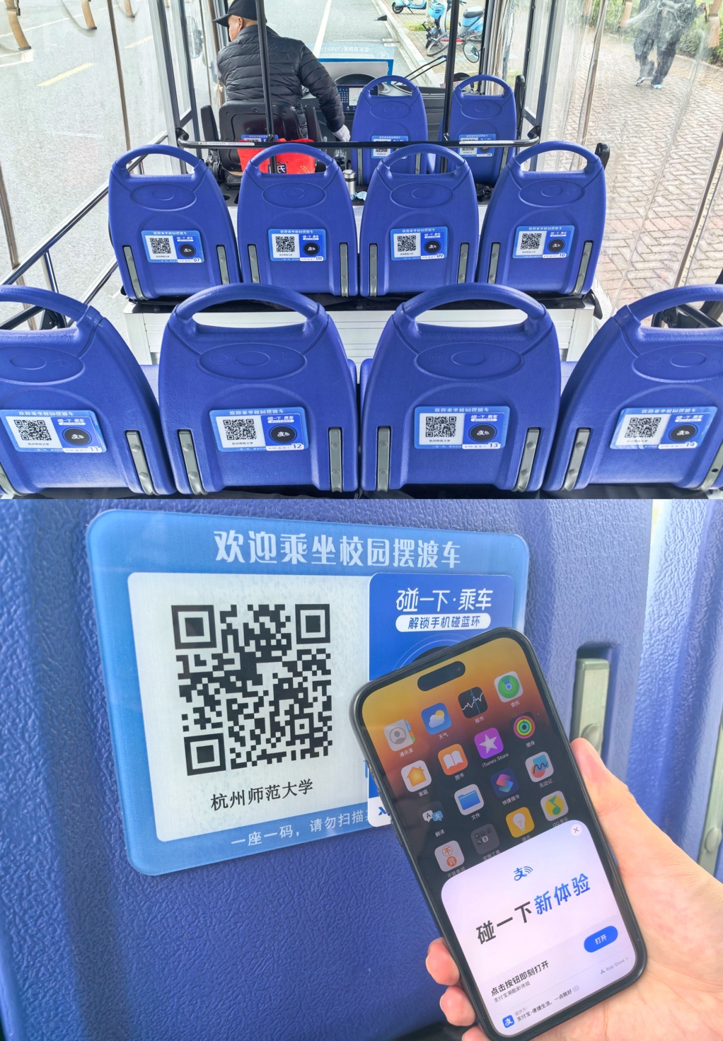 (校园公交椅背后的“碰一下乘车”智能贴) 重庆蓝精灵电动车运营管理有限公司总经理唐波表示,支付宝“碰一下”支付操作简单,上手极快,学生们不仅爱用,还自发在社交媒体上分享推荐。以往学生携带大包小包时扫码不便,如今“手机一碰就走”,显著提高了校园公交系统的通行效率。