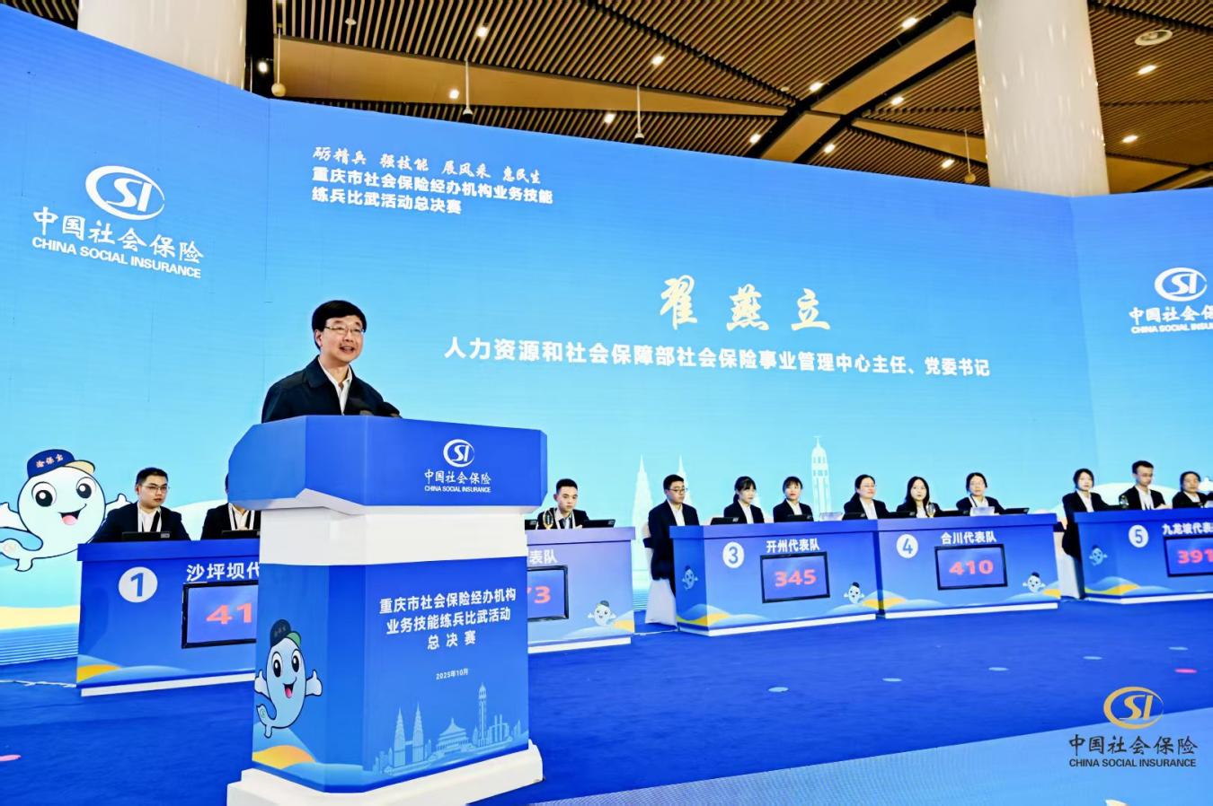▲人力资源和社会保障部社会保险事业管理中心主任翟燕立讲话 本次大赛由重庆市社会保险局主办,自启动以来,历时两个月,覆盖全市41个区县社保经办机构,吸引2043名工作人员深度参与。赛事创新采用“线上+线下”相结合的模式,依托“掌上保典”微信小程序,设置了“学习专区”“训练营地”“团体练兵”与“精英比武”四大线上板块,系统性地夯实了选手的政策基础与实操技能。经过层层选拔与激烈比拼,最终6支区县代表队、共18名优秀选手成功晋级总决赛。
