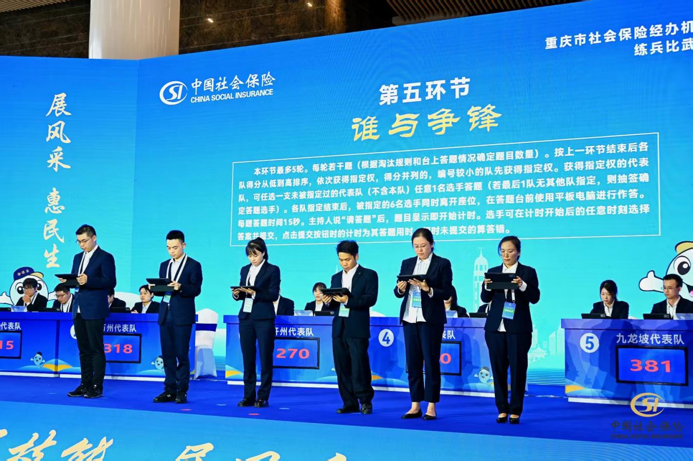 ▲2025年重庆市社保经办机构业务技能练兵比武总决赛现场 总决赛分为“初显身手”“争分夺秒”“勇攀巅峰”“群雄逐鹿”“谁与争锋”五个环节,涵盖社保参保、养老保险待遇、工伤保险待遇等各个板块的政策知识和经办要点,全面考查选手的知识储备、反应速度、团队协作与临场应变能力。在“初显身手”环节,选手需在15秒内完成答题,展现了扎实的基本功;“争分夺秒”环节则采用两两PK模式,战况激烈,悬念迭起;“勇攀巅峰”环节通过分值不等的“答题盲盒”。尤为引人注目的是“群雄逐鹿”情景演练环节,组委会通过视频,高度还原了社保日常经办的真实场景,要求团队在60秒内协作提出解决方案,充分体现了“以赛促干”的实用导向。最后的“谁与争锋”环节采用淘汰制,将比赛推向高潮。