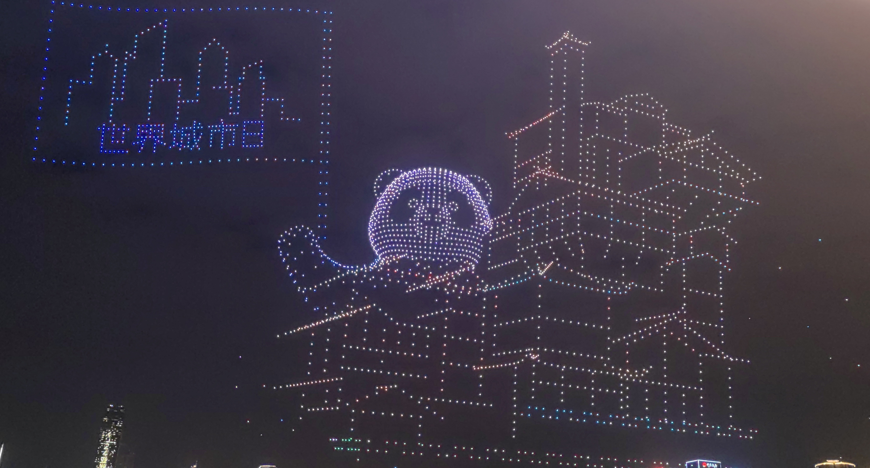 展演以一只憨态可掬的大熊猫拉开序幕,它从无人机组成的洪崖洞旁悄然探出头来,挥舞着手中写有“世界城市日”字样的旗帜,用萌趣姿态向世界发出热情的邀约。