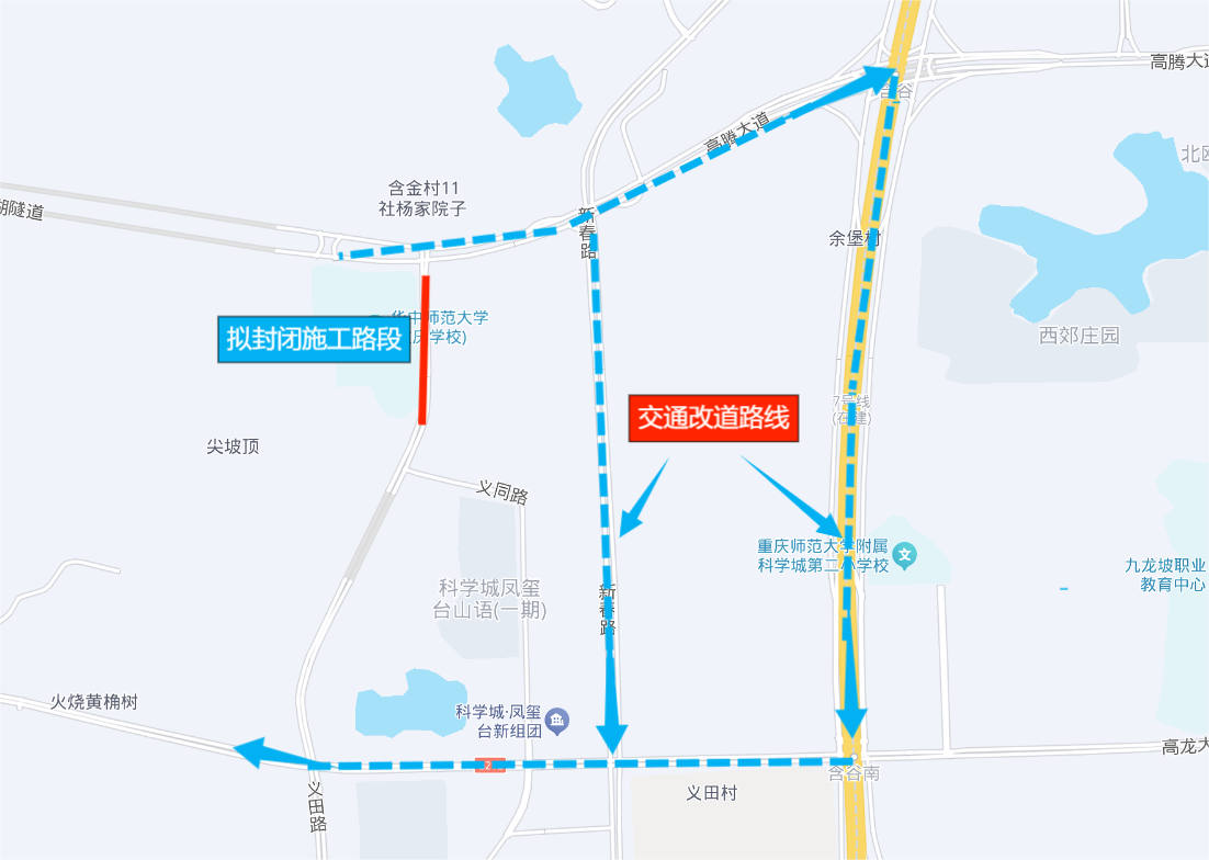 华中师范大学重庆学校项目义田路封闭施工 交通绕行提示 因华中师范大学重庆学校项目需要在义田路修建地下人行通道及人行天桥。根据《中华人民共和国道路交通安全法》第三十九条之规定,施工期间公安机关交通管理部门将临时调整义田路及周边道路的交通组织措施,请广大市民朋友提前做好出行规划。现将有关信息提示如下: