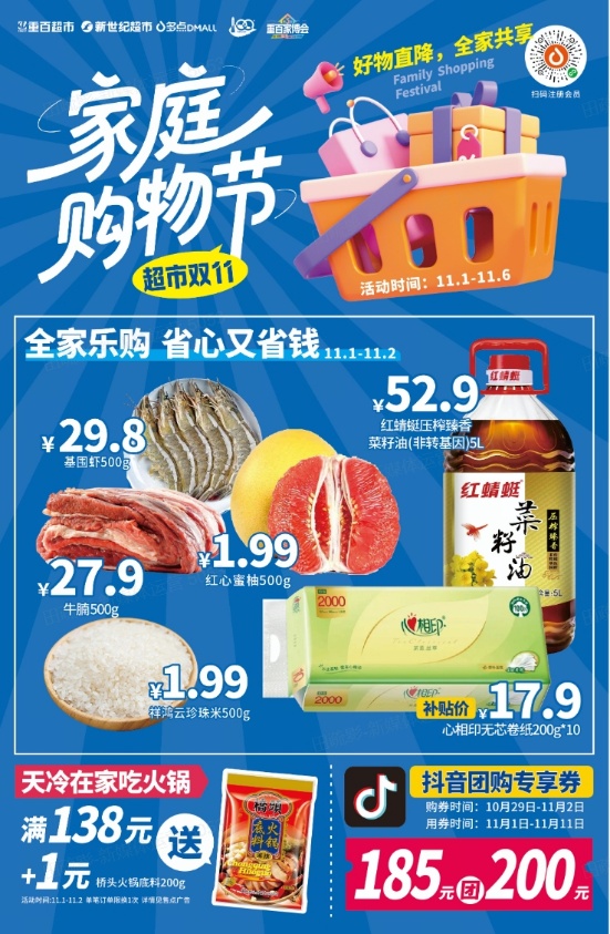 重百新世纪超市打造双十一主题活动,带来多重福利 重百新世纪超市正式启动“百年重百购物节·超市双十一”主题活动,通过线上线下联动、爆品直降、直播专享券等多重福利,为山城市民打造了一场实惠与温度并存的家庭采购盛会。本次购物节期间,超市推出多项特色优惠活动。11月1日至2日,消费者到店即可享受心相印无芯卷纸(200g*10卷)惊喜价17.9元/提的限时补贴。同时,为适应新型消费趋势,超市还开辟了线上专属通道:10月29日至11月2日,消费者通过抖音平台搜索“重百新世纪超市”进入官方团购页面,即可参与185元团200元券的直播间专享秒杀活动。 值得一提的是,为陪伴市民温暖入冬,超市特别推出暖心换购计划:周末活动期间,单笔购物满138元,仅需加付1元即可换购重庆本土知名品牌“桥头”火锅底料一袋,让市民在渐冷的冬日里轻松享受地道重庆火锅风味。 在民生基础商品方面,超市持续发挥保供稳价作用。除每日生鲜特惠——红心蜜柚低至1.99元/500g外,餐桌必备的米、油等民生商品更是以抄底价回馈市民,切实履行企业“做顾客安心米袋子、放心油瓶子”的社会承诺。