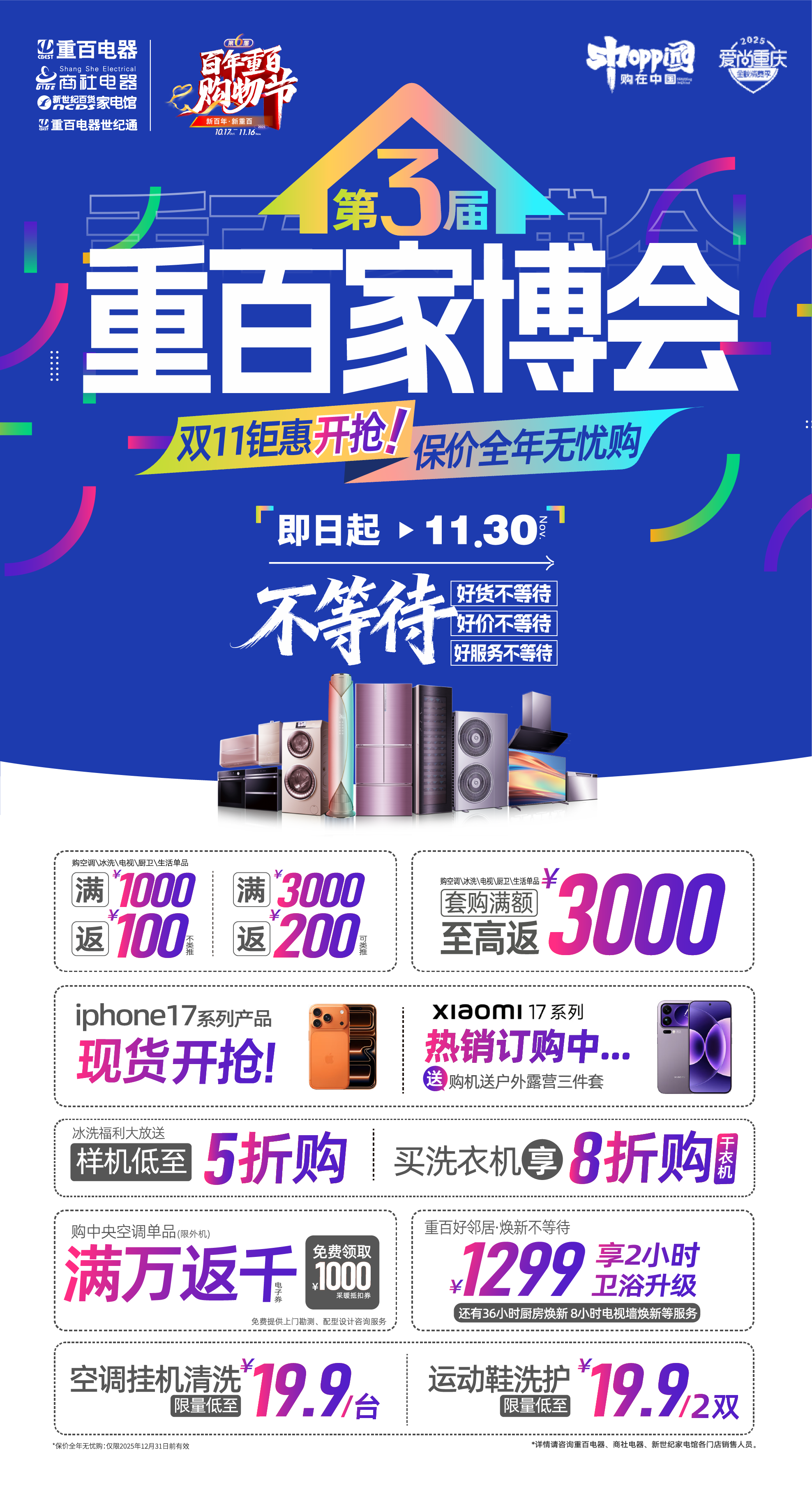 重百电器第3届家博会,价格直补20% 双十一大促火热进行。重百电器联合各大知名家电品牌,围绕“好产品不等待、好服务不等待、好价格不等待”三大核心理念,全力打造第3届重百家博会双十一家电消费主场。重百电器实现全面升级,在产品阵容、服务体验与价格补贴三大维度同步加码,为消费者带来一步到位的购物体验。 福利方面,第3届家博会推出“重百直补20%”并承诺全年保价,消费者可享爆款一口价、满千返百、套购最高返3000元等多重优惠。iPhone 17系列现场现货发售,Xiaomi 17系列同步发售,购机即送户外露营三件套。此外,样机特惠低至5折,指定品牌洗衣机享8折,中央空调推出“满万返千”专项补贴。 针对家庭局部旧改需求日益旺盛的情况,重百电器特别推出“好邻居专享套餐”,以“极速焕新”带来全新体验。套餐价格低至1299元起,即可享2小时高效的卫浴升级。更有36小时厨房焕新、8小时电视墙改造等多种快速焕新服务,由专业团队全程保障,省心省时,好服务不等待。 服务体验全面升级,“重百小哥”服务体系践行“即买即送即装”“一口价焕新”承诺,重庆中心城区可实现“上午买、下午送”。会员还可享19.9元空调挂机清洗、运动鞋洗护等高性价比服务,全方位提升消费体验。