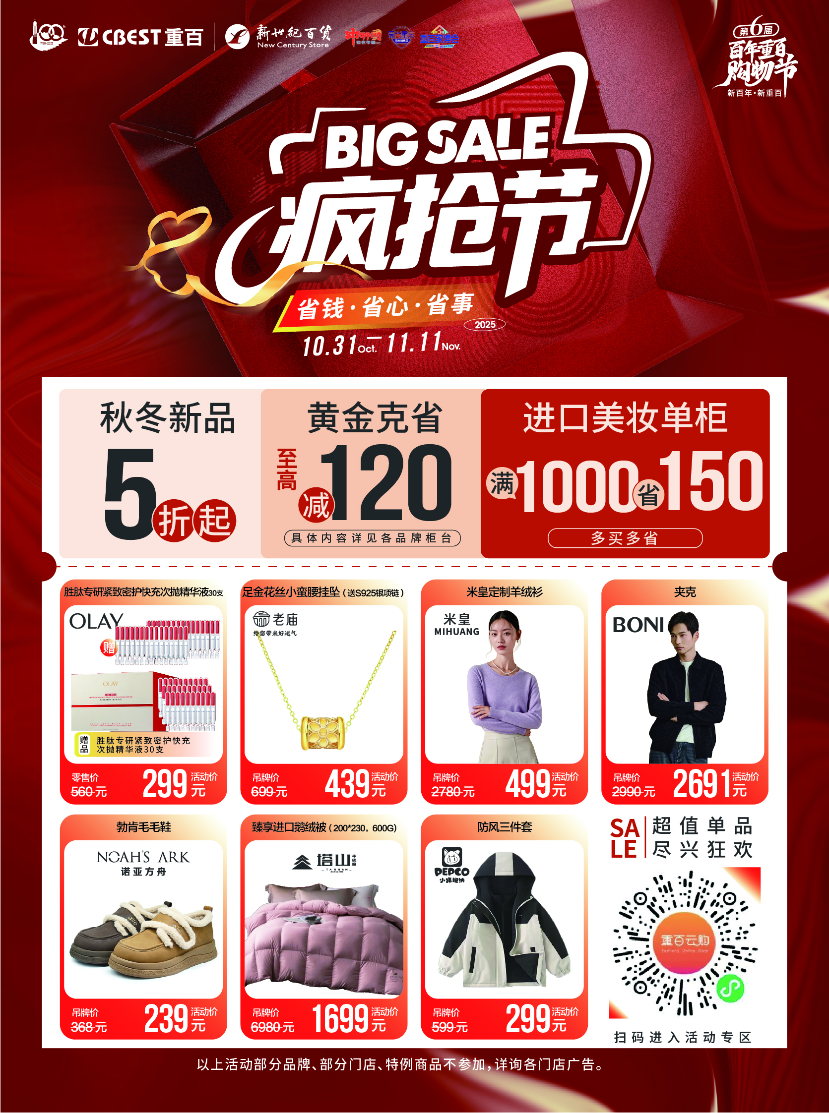 | 第六届百年重百购物节,“幸福盲盒”空降重庆!即日起至11月2日来解放碑步行街打卡抽大奖,用支付宝碰一下,有机会赢iPhone17!在双十一购物狂欢季来临之际,重庆百货旗下百货、超市、电器、汽贸四大业态,推出系列促销活动,为山城消费者带来一场覆盖生活全方位的购物盛宴。从日常百货到民生超市,从智能家电到前沿汽车,多重福利叠加,诚意满满,助力市民畅享品质生活。 重百新世纪百货“疯抢节”启动,四大“省”心福利打造购物盛宴 10月27日起,重百新世纪百货正式开启“疯抢节”大型促销活动,以“抄省清单”为主题,围绕“省钱、省心、省时、省事”四大维度,推出多款地板价商品及品牌日活动,为消费者提供一站式高品质购物体验。 本次疯抢节通过“价格+品质+服务+场景”四重保障,全面诠释“省”的内涵。 省钱:推出多款补贴爆品,如499元米皇100%羊绒衫、199元墨素羽绒服、88元六福转运珠等,服饰、美妆、家居类商品低至1.9折起; 省心:严控商品品质,保障货品对标描述,杜绝“货不对板”; 省时:由专业导购提供精准推荐,减少比价时间,优化购物效率; 省事:整合购物、餐饮、娱乐等多业态场景,实现“一站式购齐”。 活动期间,雅戈尔、李宁等头部品牌同步推出专属福利:雅戈尔新品8折后满1000减100,李宁会员享三件8.5折、满800减100。 “疯抢节”不仅强调低价,更注重购物全流程的便捷与安心。通过商品优选、场景融合与服务升级,让消费者在享受优惠的同时,真正实现“选择重百新世纪,就是选择省”。 本次活动将持续至11月11日,线上线下同步开展,消费者可通过重百云购平台及线下门店参与,解锁“抄省盲盒”等互动福利。