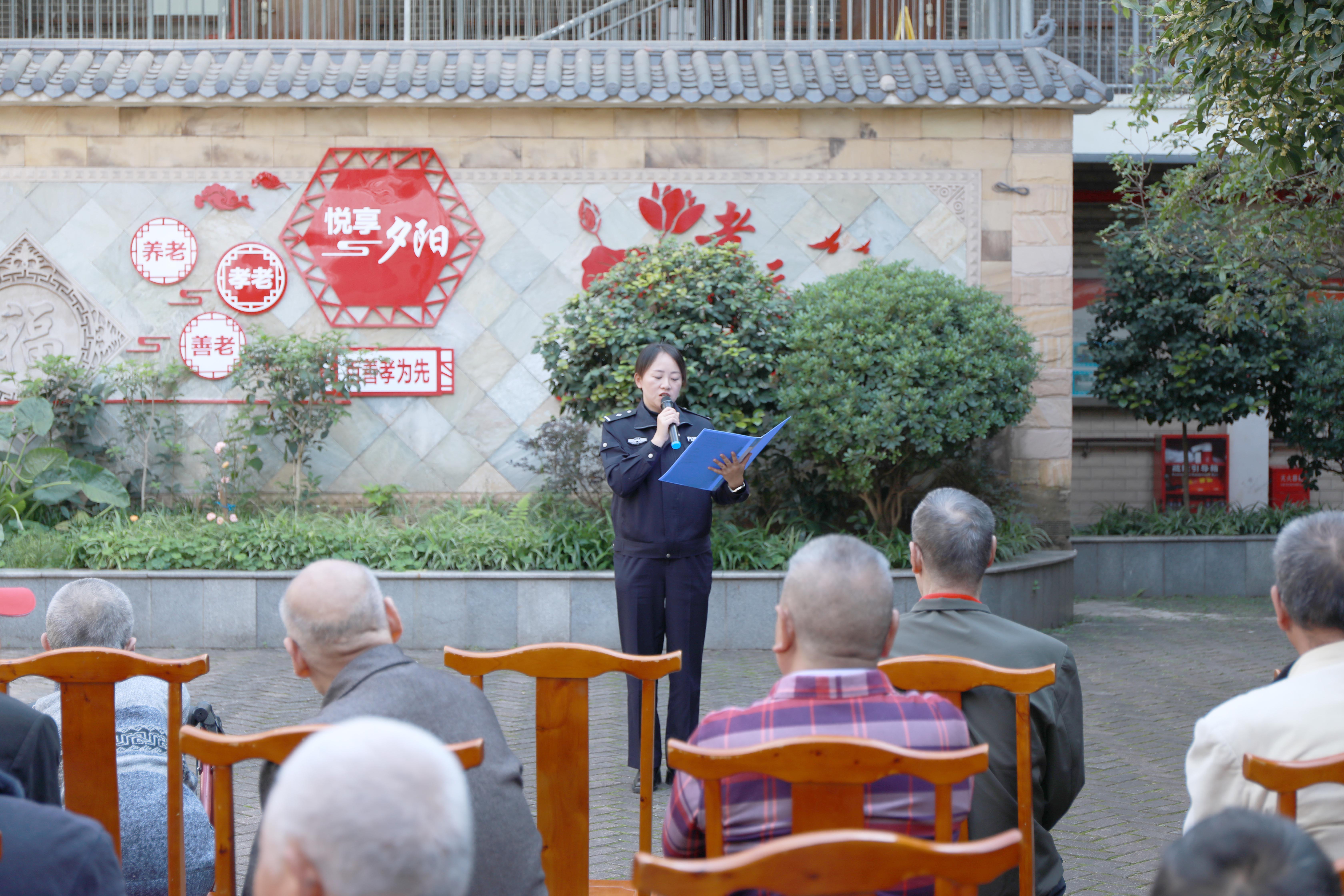 ▲经侦民警分享养老诈骗案例 在女警突击队为敬老院老人送温暖的同时,辖区各派出所也围绕重阳节主题,开展形式多样的护老、敬老活动,让老年群体全方位感受节日关怀。 10月23日上午,白市驿派出所联合驿都社区,深入重阳节活动现场开展反诈宣传。社区民警张华以拉家常的方式,结合辖区李婆婆险些被“购买保健品”骗局欺骗的真实案例,从“冒充熟人”“投资理财”“冒充公检法”等常见骗局入手,详细讲解防范要点,特别提醒老年人警惕“以房养老”“保健品”“祖传秘方”等针对性骗局。