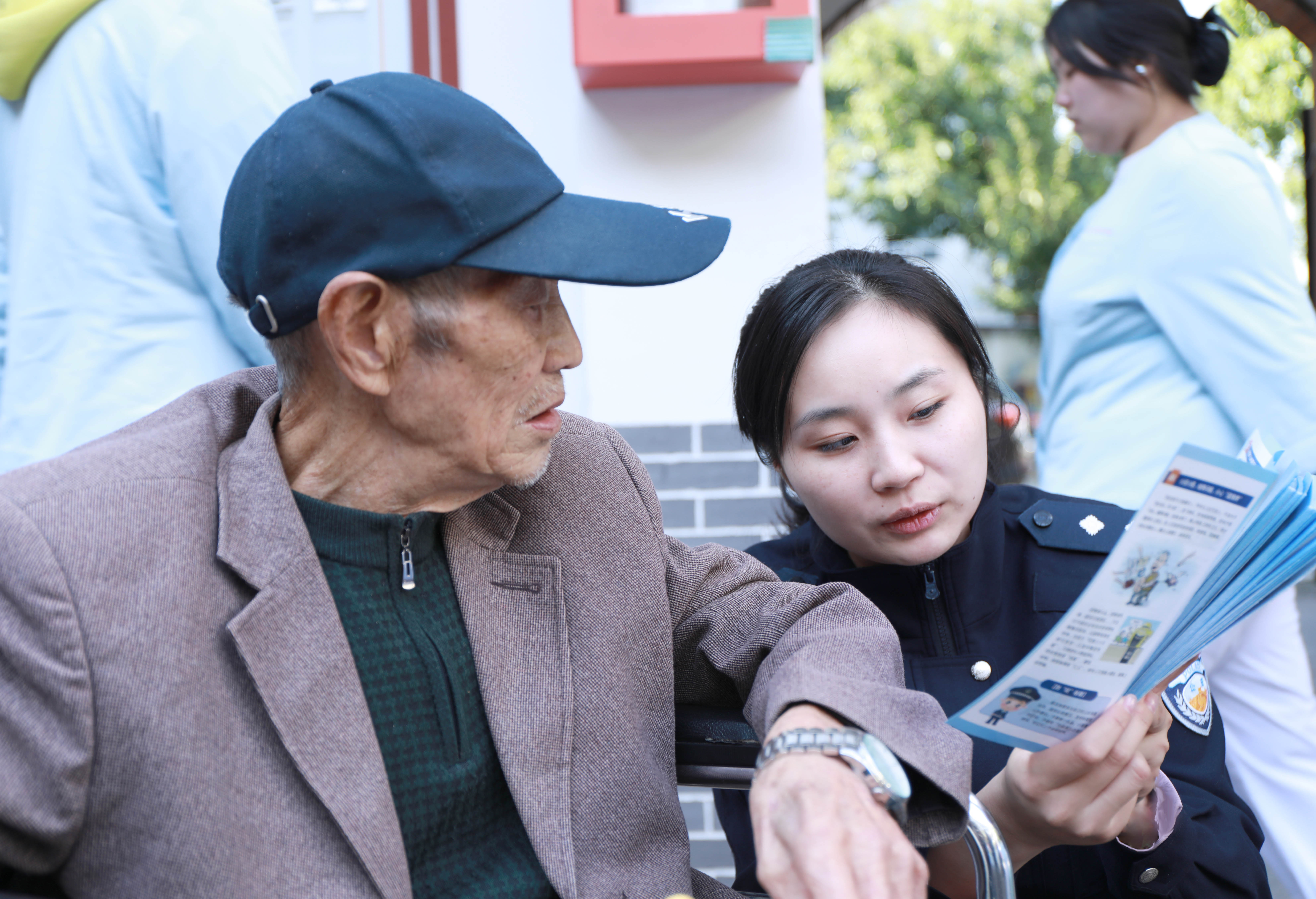 ▲香炉山派出所民警谭茂林为群众发放宣传单 西永派出所的社区老民警刘伟,将关怀送到了辖区敬老院。他与老人们亲切拉家常,仔细询问身体状况和生活需求。在了解到老人的生活情况后,还成功调解了两名老人因日常小事产生的矛盾,让两人重归于好。