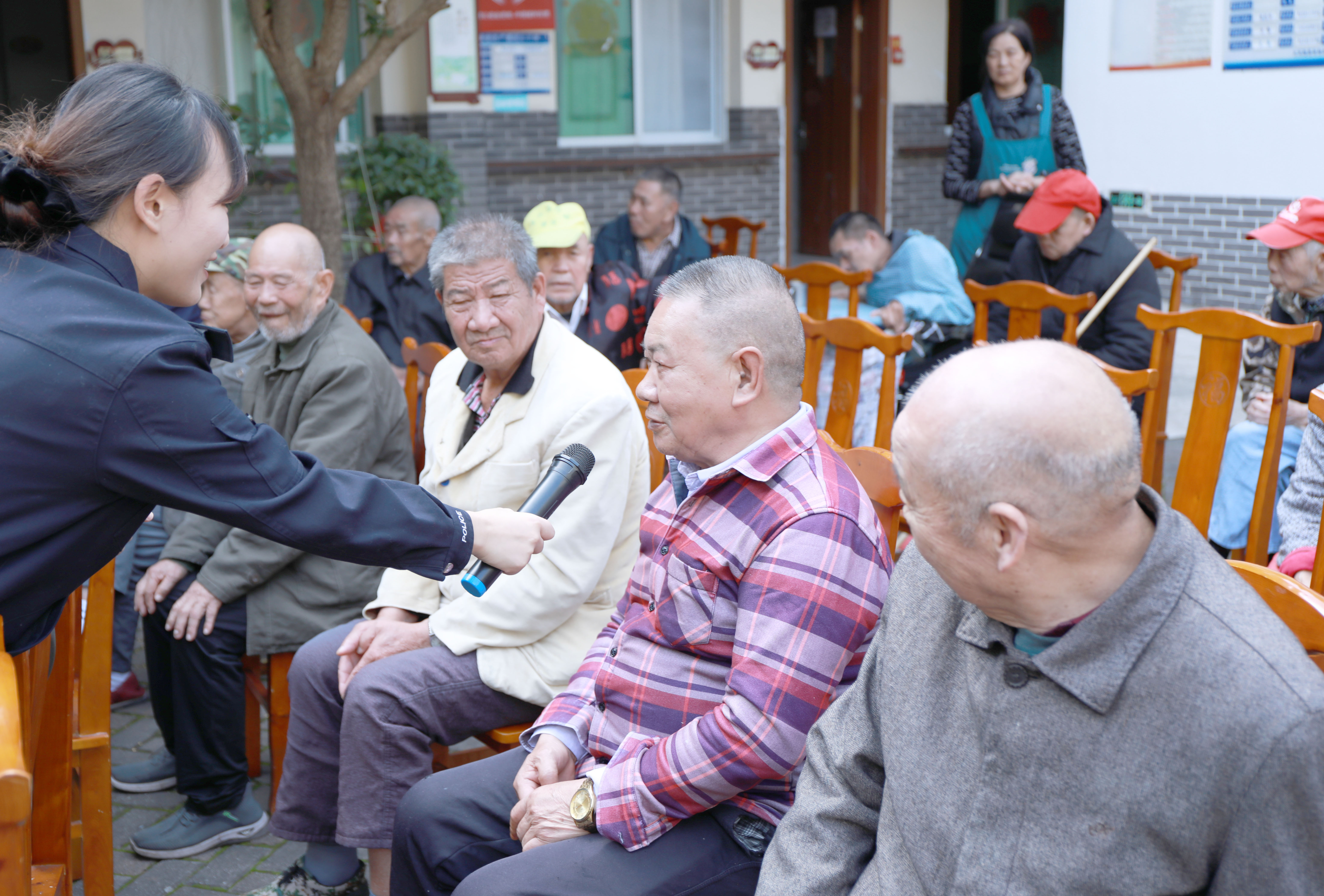 ▲女警突击队队员冉清青和老人互动 “免费体检说‘病重’,逼你买药别冲动”“‘免费疗养’说得甜,不告院长别跟连……”队员侯钰用一段朗朗上口的反诈顺口溜拉开序幕。
