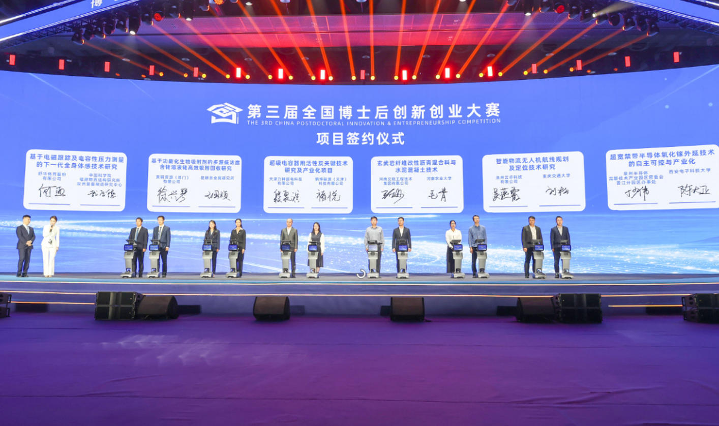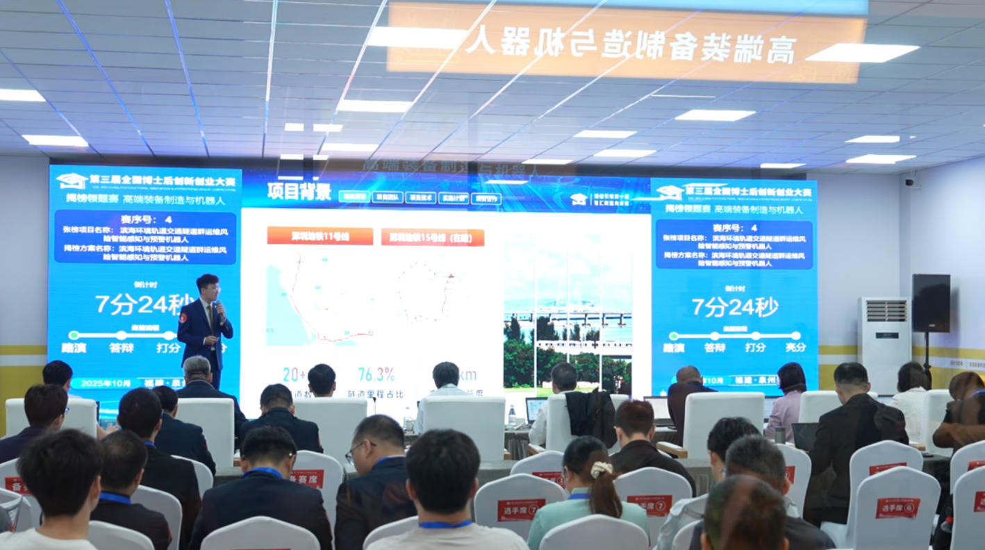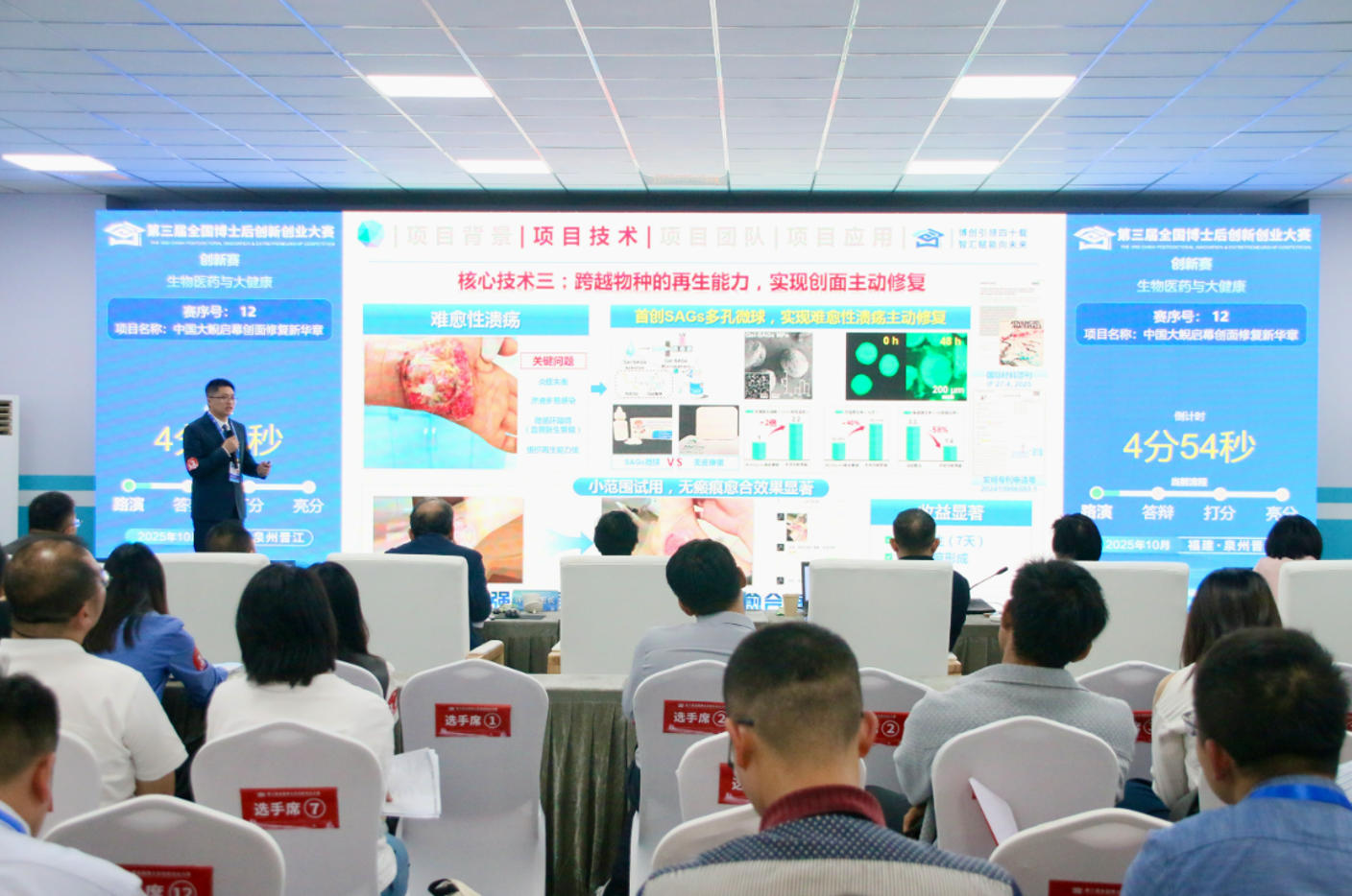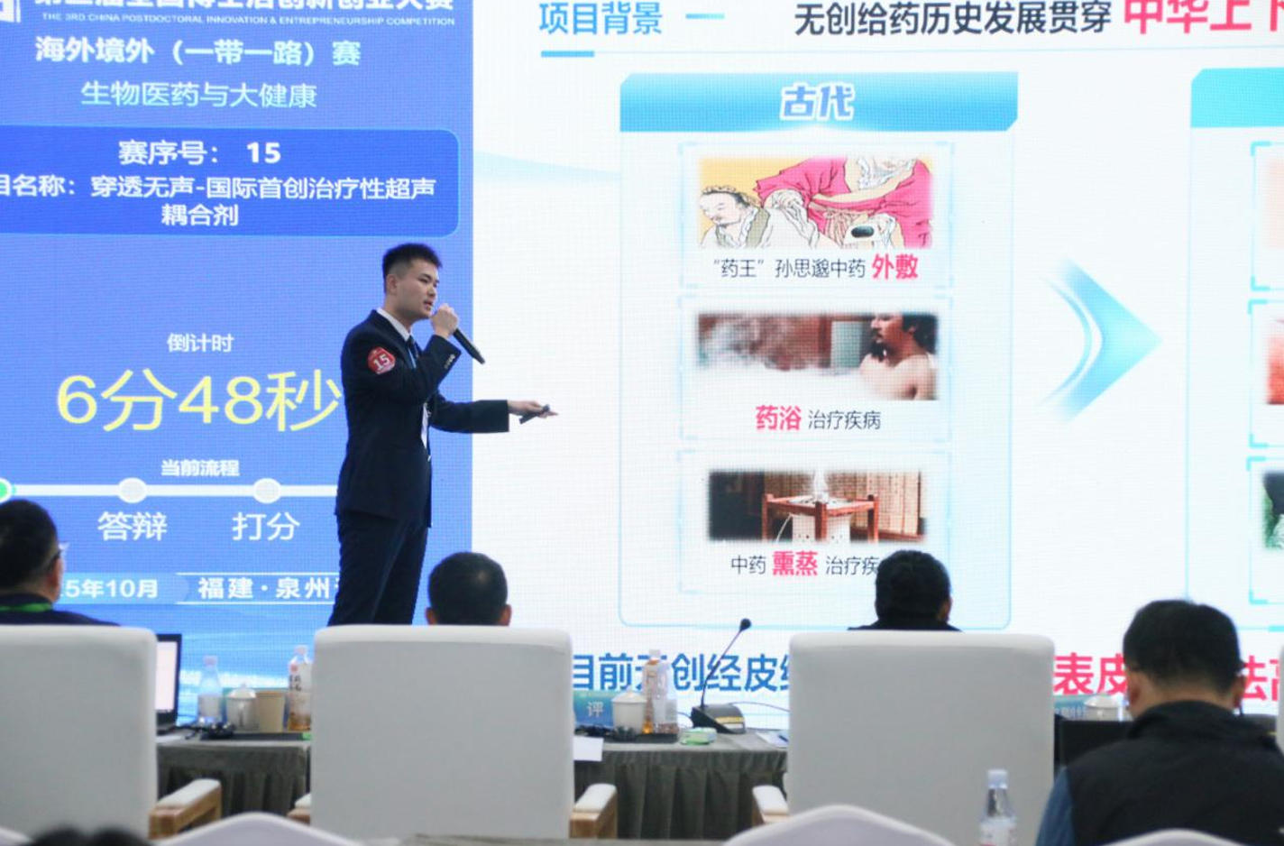 第三届全国博士后创新创业大赛金奖获得者韩晓宇进行项目路演 来自重庆医科大学的博士后韩晓宇凭借《穿透无声——国际首创治疗性超声耦合剂》项目一举夺魁,荣获海外赛生物医药与大健康赛道金奖。重庆大学张小宁博士的项目《沿海软土高承载高效生态固化技术及快速精准评价装备研发》,聚焦我国沿海软土地区关键基础设施高质量高效建造,构建了沿海软土高承载高效生态固化技术体系,可实现建造全过程小时级响应,为国防与民用基础设施快速建造与安全运营提供了坚实支撑。