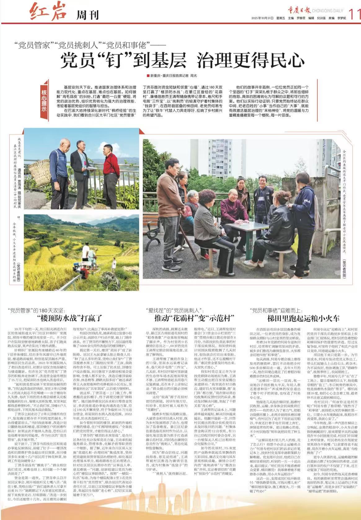 核心提示 基层安则天下安。推进国家治理体系和治理能力现代化,重点在基层,难点也在基层。如何破解“鸡毛蒜皮”的纠纷、打通“最后一公里”梗阻,将党的政治优势、组织优势转化为强大的治理效能,考验着基层党组织的智慧与担当。 在巴渝大地持续深化新时代“枫桥经验”的生动实践中,我们看到合川区太平门社区“党员管家”丁贤芬面对资金短缺和邻里“心墙”,通过180天攻坚打赢了“楼顶防水战”;在綦江区曾经的“花霸村”,廉情信息员王清帮随身携带记录本、卷尺和手电筒“三件宝”,以“挑刺员”的较真守护着村集体的“钱袋子”;在酉阳县层叠的梯田间,老党员何易专为了让“铁牛”代替人力奔走呼吁,拉响了乡村振兴的希望汽笛。 他们的故事并非孤例,一位位党员正如同一个个坚固的“钉子”深深扎根于群众之中,将那些细碎的抱怨、具体的困难转化为可解的议题和可行的方案。他们以实际行动证明:只要党员始终站在群众中间,把老百姓的“小事”当作自己的“大事”,就能有效激活基层治理的“末梢神经”,将党的温暖与力量精准播撒至每一个楼院、每一片田垄。