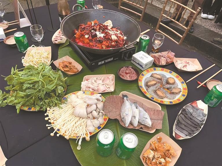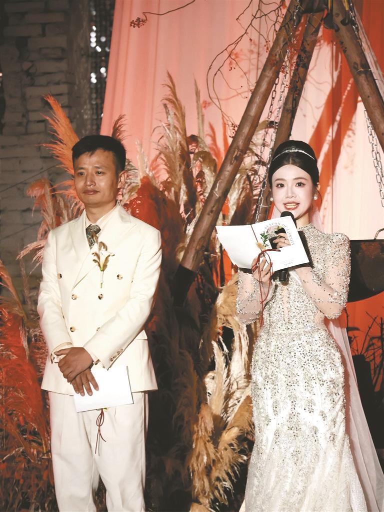 “一种味道代表一座城市,在我眼里就是火锅——它的热辣滚烫、麻辣鲜香,最能表达感情。”11月1日傍晚,一场以“火锅为宴、山城为景”的婚礼在重庆山城巷仁爱荒野公园举行。滚烫的锅底在席间翻涌;“力哥”抬着上百斤的火锅底料大锅,喊着“雄起”的口号,声音在千米梯坎间回荡;爵士乐与锅底的沸腾声、亲友的欢笑声交织成韵…… 火锅见证爱情 婚礼现场,火锅沸腾弥漫的麻辣鲜香与亲友们的欢声笑语交织,营造出轻松有趣的氛围。火锅不仅是这场婚礼中的美食,更成为情感交流的独特载体。