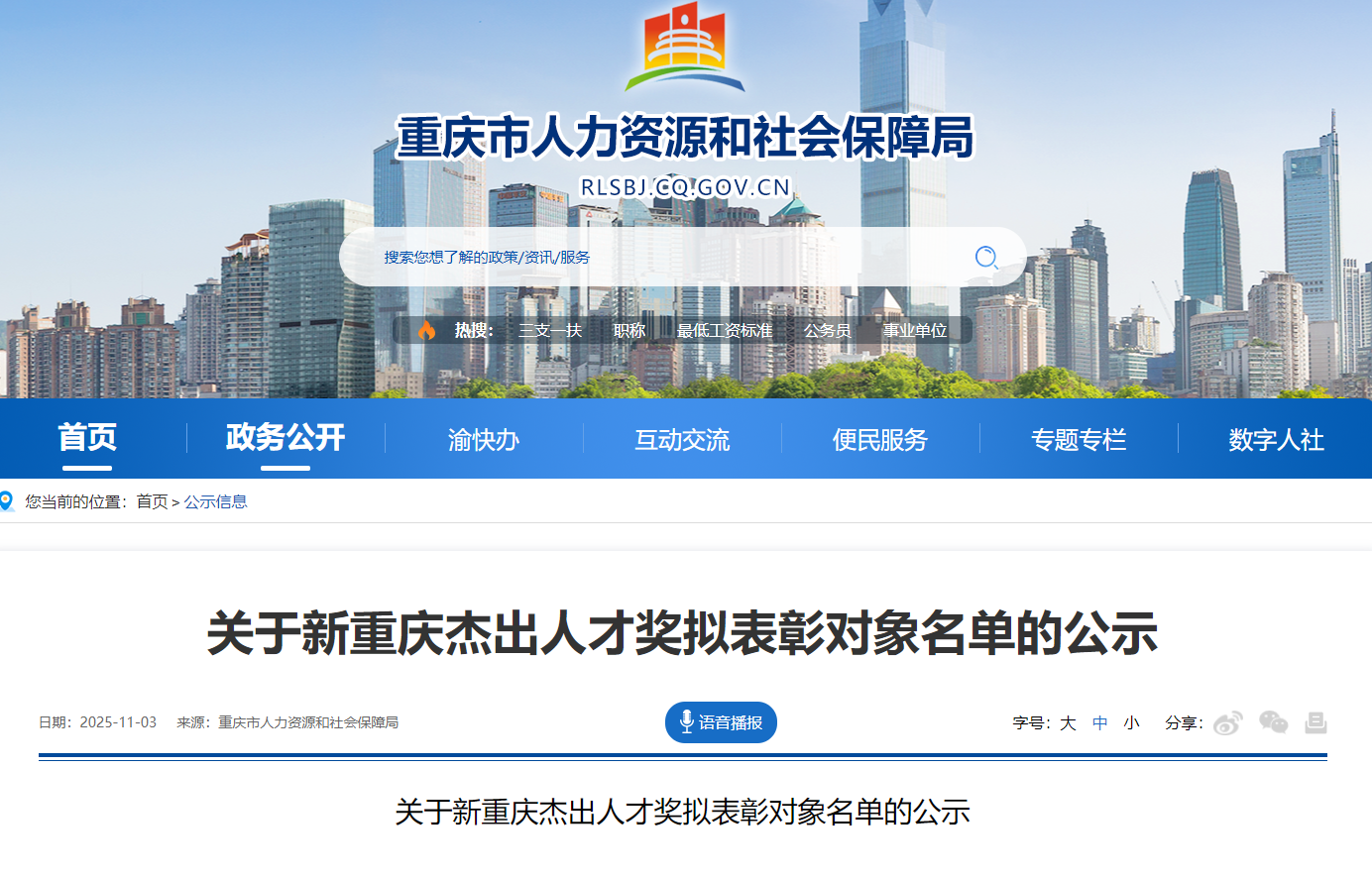11月3日,重庆市人力资源和社会保障局发布《关于新重庆杰出人才奖拟表彰对象名单的公示》(以下简称《公示》)。 《公示》称,根据《关于开展新重庆杰出人才奖评选表彰工作的通知》(渝委办〔2025〕28号),市委组织部、市人力社保局联合开展了新重庆杰出人才奖评选工作。经逐级推荐,在广泛征求意见的基础上,通过资格审查、专家评审、评选表彰工作专班审议等环节,确定了代方银等18人作为新重庆杰出人才奖拟表彰对象。为体现公开、公平、公正原则,充分发扬民主,广泛听取意见,主动接受监督,保障群众知情权、参与权和监督权,现将拟表彰对象予以公示。 新重庆杰出人才奖拟表彰对象名单 (共18名,按姓氏笔画排序) 代方银 西南大学 印 奇 重庆千里科技股份有限公司 付晓君 中电科芯片技术(集团)有限公司 刘汉龙 重庆大学 吴保安 重庆材料研究院有限公司 何 鹏 重庆卡涞复合材料有限公司 邹全明 陆军军医大学 张 波 重庆文学院 张晓宇 重庆长安汽车股份有限公司 陈 娟 重庆医科大学 周 林 赛力斯集团股份有限公司 骆名文 重庆美的通用制冷设备有限公司 袁 伟 重庆市人民医院 高光勇 重庆山外山血液净化技术股份有限公司 黄 伟 重庆医科大学附属第一医院 黄金秀 重庆市畜牧科学院 梁 攀 重庆工信职业学院 蒋 林 重庆机床(集团)有限责任公司 原标题:事关新重庆杰出人才奖,18人拟获表彰→ 编辑:蒋丽霞 校审:罗再芳 总值班:周圆 |