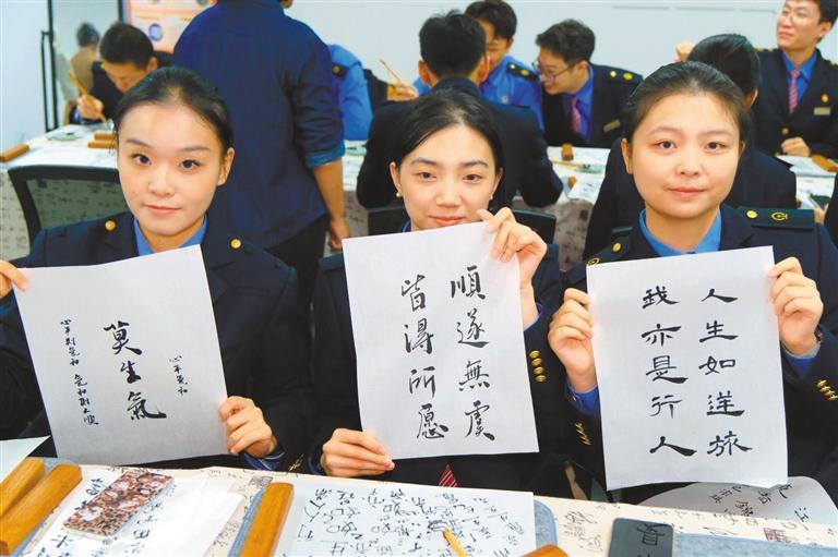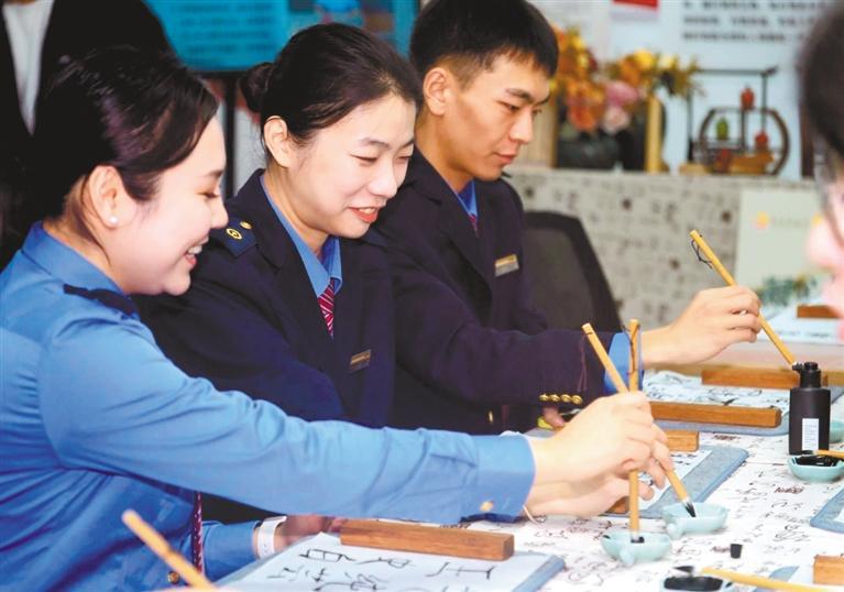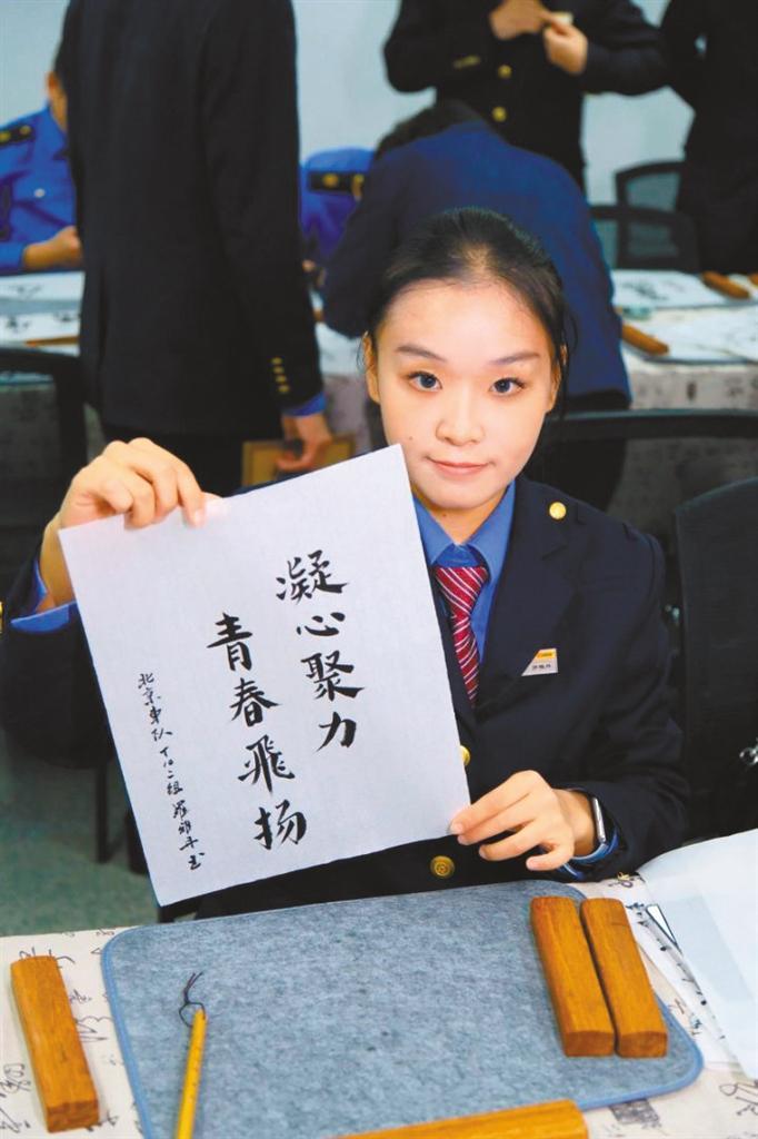 活动中,来自“北京车队T10次2组”的青年职工罗雅丹是现场的“书法达人”,她分享了自己书法的学习之路。“我学书法18年,书法已经成为我生活中不可或缺的一部分。”罗雅丹表示,书法是她与传统文化对话的桥梁。每一次提笔,都是一次内心的沉淀。她的作品笔法娴熟,引来阵阵赞叹。