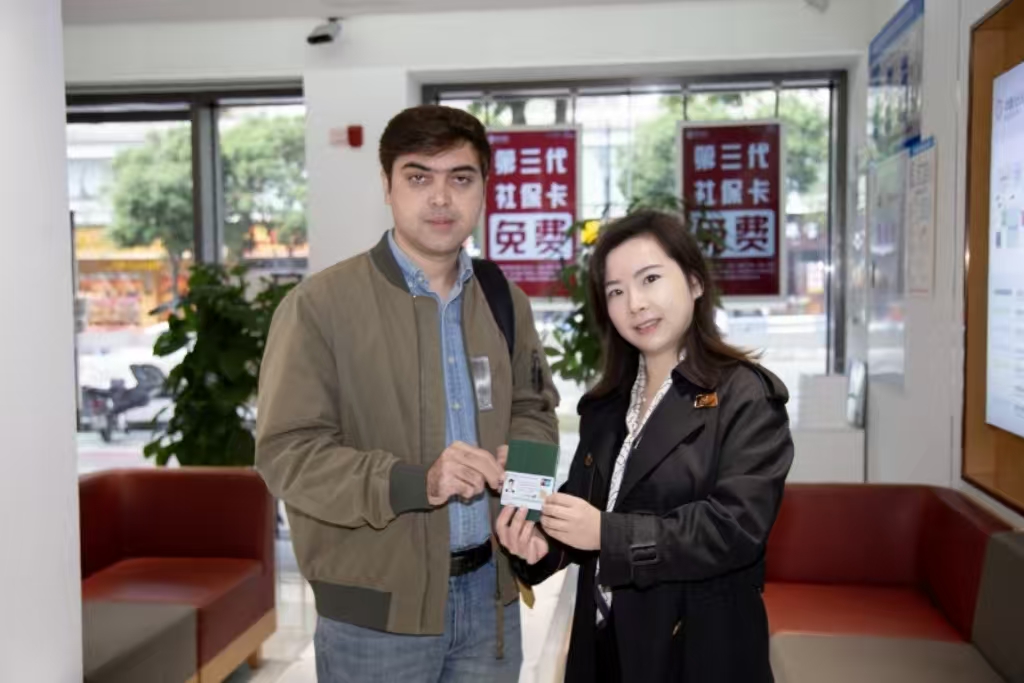 ▲安森在重庆领到了自己的社保卡 “以前办事要随身携带工作许可证、社保卡、护照等多种证件,现在就医、消费、乘公交、借书等场合,一张卡全搞定。”来自巴基斯坦的安森是重庆首批“聚英卡”持有者之一。安森是毕业于中国科学院的博士生,专研人体骨科和皮肤相关医学材料。今年4月,通过人才引进来到高新区金凤实验室工作的他,深切感受到了聚英卡带来的便利。他感慨道,这张卡不仅简化了生活流程,更让他获得了身份认同,真切感受到城市的包容。 “来渝工作的外籍群众在申领了加载工作许可证信息的电子社保卡后,到我们社保卡服务网点提交护照办理实体社保卡申领,几个工作日就能拿到证卡融合后的“聚英卡”了。”重庆市社保卡中心发行管理科邓雨霁表示,“聚英卡”的发行贯通了社保卡系统、外国人来华工作系统以及渝才荟系统,切实达成了信息的互通共享,为到重庆工作的外国人提供更加高效便利的综合服务。