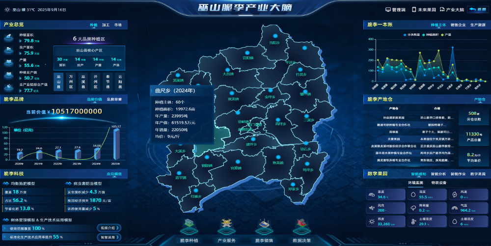 ▲巫山脆李产业大脑。受访者供图 王恩海提到的“产业大脑”是一个名为“巫山脆李产业大脑”的数智化运行平台,涵盖了“李好管家”“李好生产”“李好服务”“李好金融”“李好决策”5个一级核心业务应用场景和26个二级应用场景,如经营主体电子档案、生产技术智慧运用、农事生产追踪溯源、电子交易中心等,实现从生产到消费各个环节数据的有效应用,让数据助力产业高质量发展。 “以前县里的果农,很大程度上是靠天吃饭。用上‘产业大脑’后,实现了从望天收到‘掌中控’。”巫山县果品产业中心主任刘仁鹏说。 如今,当地已有近4000户种植户接入“巫山脆李产业大脑”,覆盖种植面积22.31万亩,并通过“李好生产”指导种植技术,实现农事管理、果园管护;通过“李好服务”,果农遇上技术难题可在线咨询农技专家。 截至目前,全市上线运行生猪、脆李等5个产业大脑,培育15个未来农场,以“产业大脑+未来农场”为牵引促进农业全产业链数字化转型。 03 产品向优 生态“含绿量”带来发展“含金量” 绿色发展的成果,最终呈现在千家万户的餐桌上:青菜头加工成的榨菜风靡全球,巫山种植的青脆李供不应求……越来越多的绿色优质农产品,正从田间直达餐桌,既满足了消费升级的需求,也为农民带来了实实在在的收益。