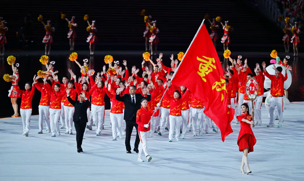 11月9日晚,第十五届全运会开幕式在广东省奥体中心体育场举办。在热烈的氛围中,重庆市体育代表团迈着整齐而坚定的步伐入场。引领重庆代表团入场的旗手,是巴黎奥运会艺术体操集体全能冠军丁欣怡。