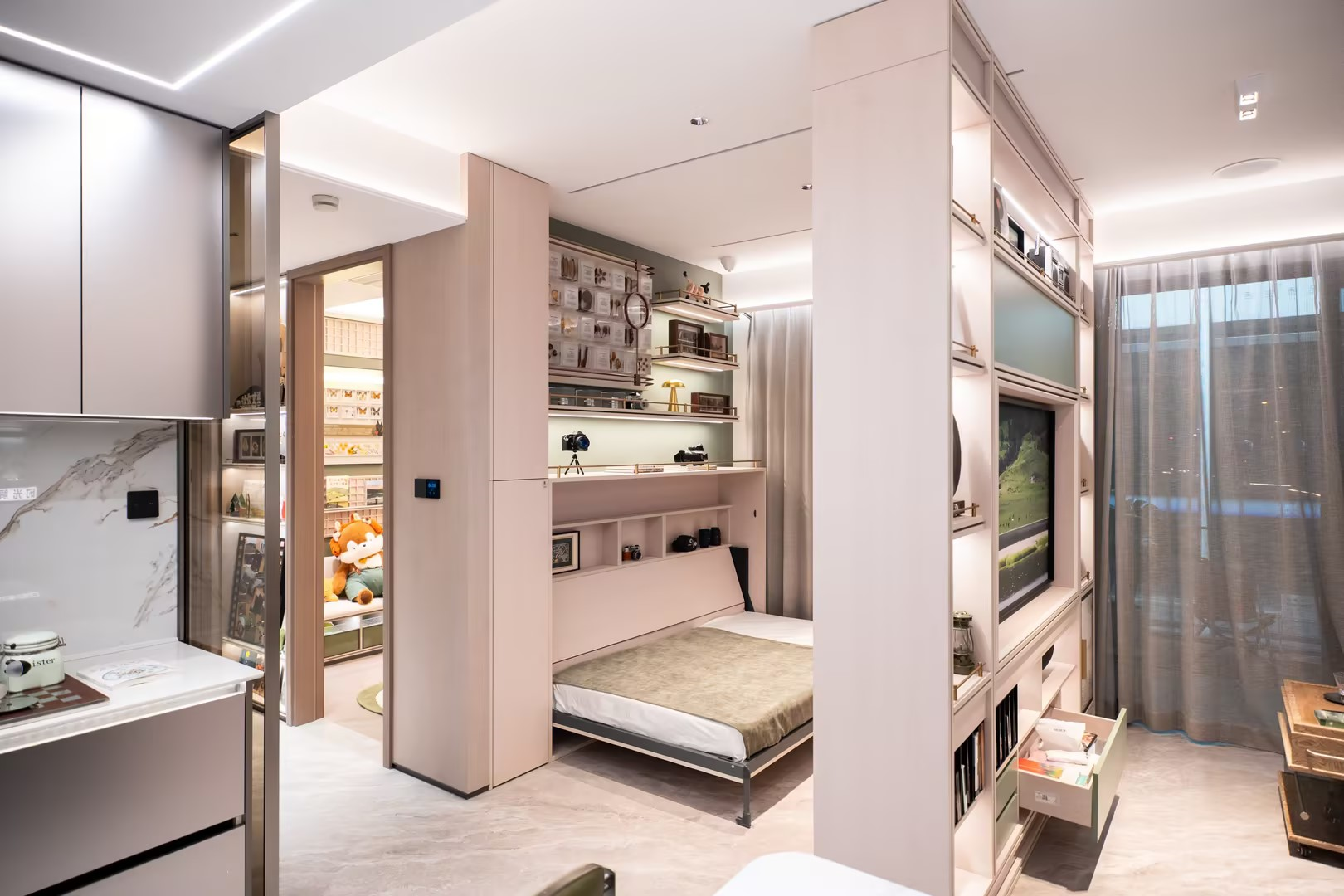 (联发现场创新演绎的可变空间,柜体下翻为床后,79小户型可再加一房。图/现场拍摄) 此外,联发还以“空间折叠术”释放空间的效能:创新的1.9卫设计以双马桶布局化解早高峰拥堵,更有美妆龙头、美妆灯、镜柜集成收纳模块等细节,为女主人打造站立式美妆提案;厨房通过“拿洗切炒盛”一体化动线与智能厨电配置,让烹饪从家务变享受;玄关处的洞洞板与珐琅板则化身“情绪开关”,打造从外界到家的心灵缓冲带。
