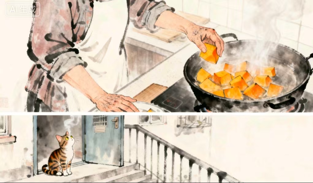 南瓜粥里的暖文/赖永亮母亲教我熬南瓜粥,头一桩事就是挑瓜。她那带着茧子的指节,总是挨个拍拍那些裹着厚厚白霜的南瓜,就像拍自家熟睡的孩子一样。“瞧见没?”她笃定地说:“这霜,是秋天给南瓜捂的被子,捂得越严实,瓤子就越甜。”她的目光扫过那些疙疙瘩瘩的瓜皮,像是在点数自家孩子。道理很简朴,这是我第一次真切摸到土地带来的那份实在的温热。 刚开始接触这硬家伙,老让我很苦恼,一刀砍下去,“咚”的一声闷响,刀刃就啃出个白印子,震得我手心发麻。母亲笑嘻嘻地抢过刀:“傻孩子,不能蛮干,要顺着它的劲儿。”她手腕轻轻一抖,刀锋斜斜探进瓜蒂旁边的缝隙,“咔嚓”“咔嚓”几声脆响,南瓜就乖巧地咧开嘴,露出里面金灿灿的瓤,湿漉漉的南瓜籽粘在瓜肉上。锅里的米早就在沸水里咕嘟咕嘟地开了花,白汽腾腾,把瓜块扔进去,就老实了。母亲拿着长柄木勺守在灶边,轻手轻脚撇掉浮起来的白沫。等米粒和南瓜都烂熟,那股甜丝丝的味道就慢慢从锅盖缝里钻出来,在厨房里飘荡,暖融融地罩住人。 这灶上的暖和气儿,不知怎么,就飘到了门外。